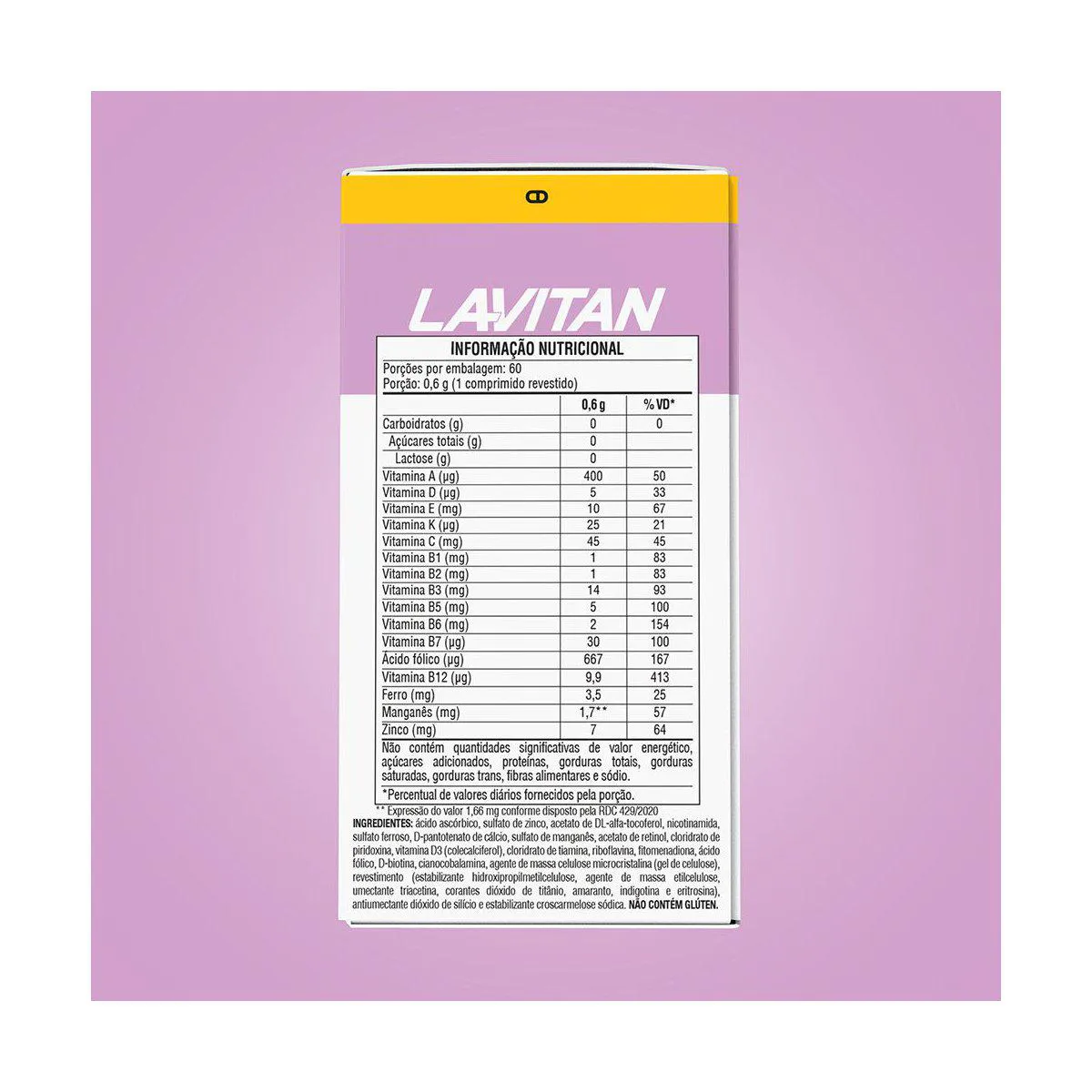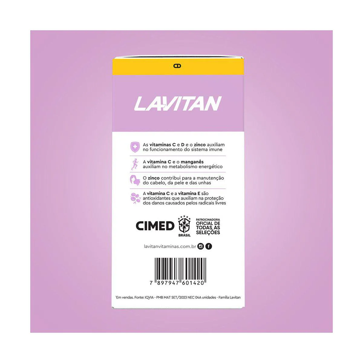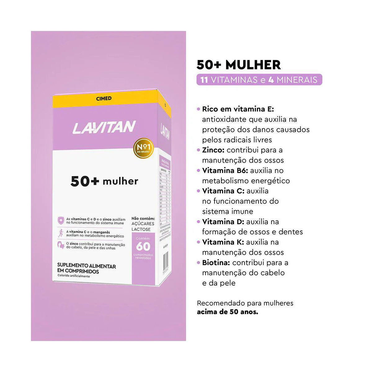 Lavitan 50+ Mulher é um suplemento alimentar em comprimidos revestidos desenvolvido para mulheres acima de 50 anos. Sua fórmula possui vitamina c e D, manganês e zinco, além de ser livre de açúcares e lactose. Lavitan 50+ Mulher está disponível em embalagem com 60 comprimidos.