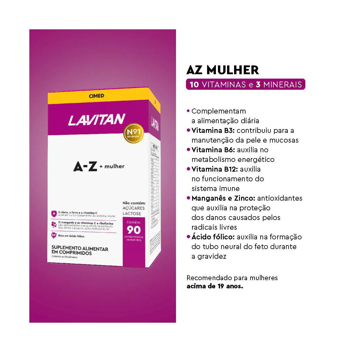 Lavitan A-Z Mulher é um suplemento vitamínico mineral em comprimidos, específico para complementar as necessidades nutricionais femininas quando associado a uma dieta equilibrada e hábitos de vida saudáveis. É livre de glúten, calorias e lactose. Este produto está disponível em embalagem com 90 comprimidos.