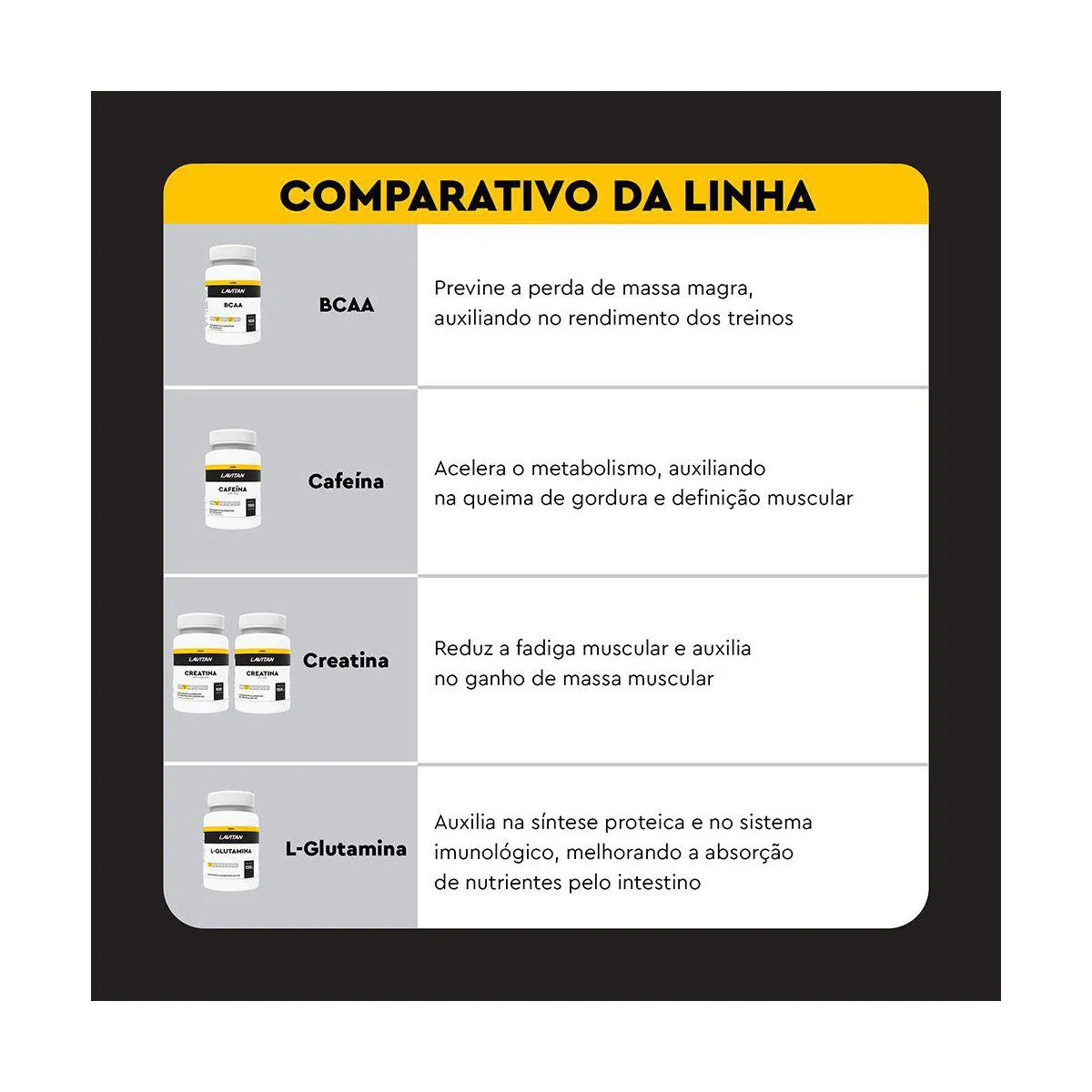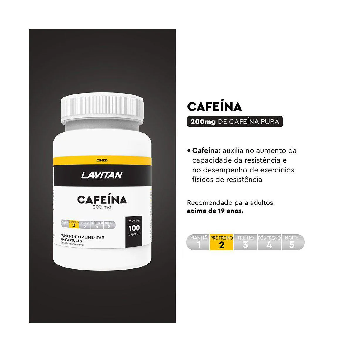 O suplemento Lavitan Cafeína auxilia no aumento do estado de alerta e melhora a concentração, além de oferecer ação termogênica que acelera o metabolismo e auxilia na queima de gordura e definição muscular.