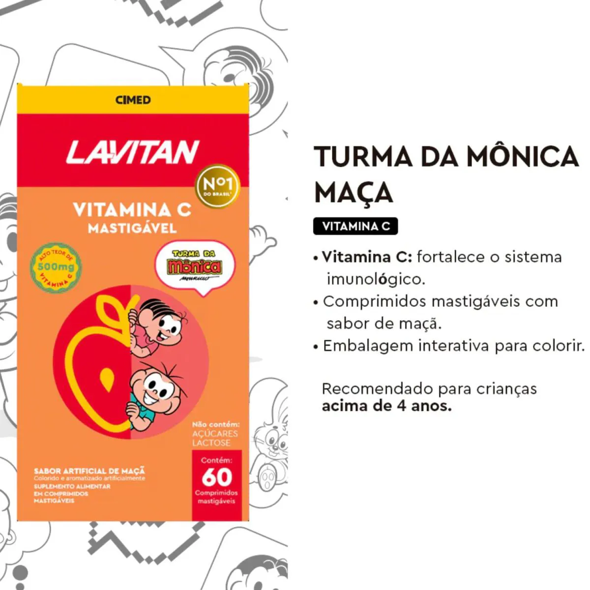 Lavitan infantil vitamina c Maçã 60 Comprimidos Mastigáveis – Cimed Suplemento infantil sabor maçã, desenvolvido para fortalecer a imunidade e dar mais energia ao dia a dia. Comprimidos mastigáveis, práticos e com sabor agradável para facilitar a rotina das crianças. Diferenciais