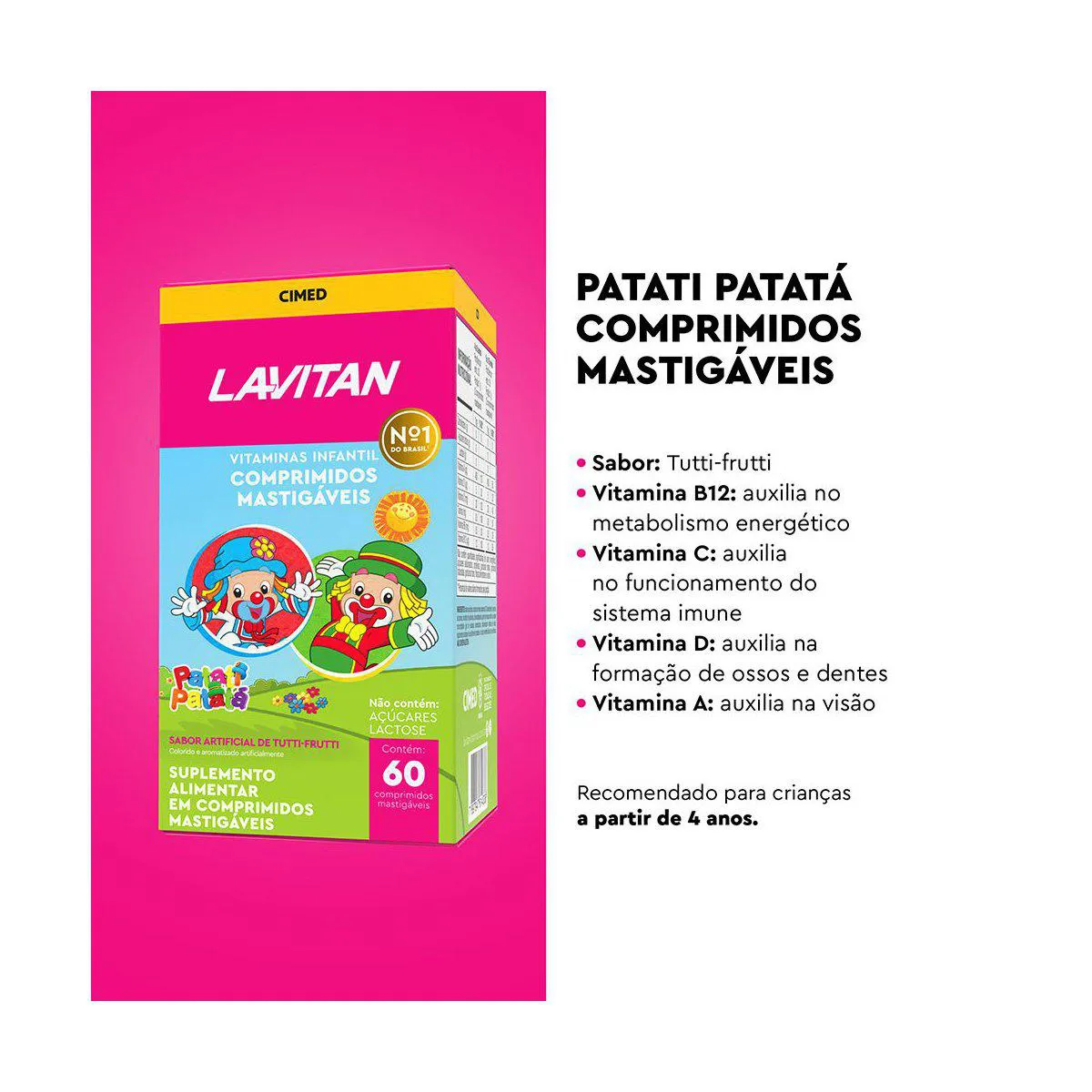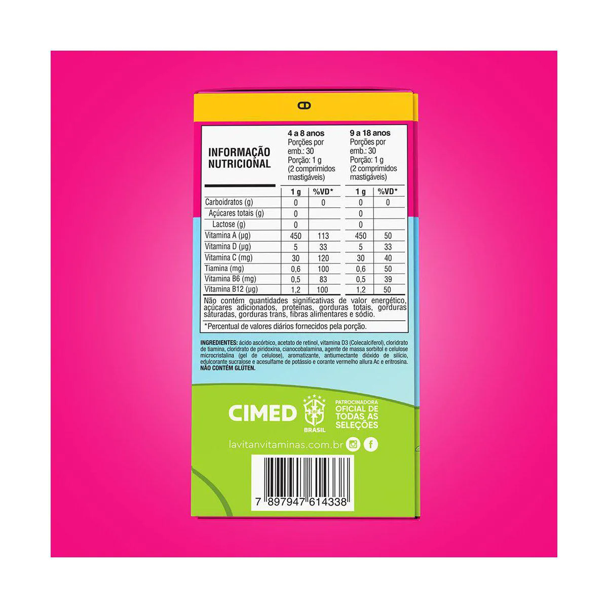 Sem adição de açúcar e zero lactose, o Suplemento Vitamínico Lavitan Kids está disponível em comprimidos mastigáveis com sabor de tutti-frutti (artificial). É uma forma gostosa e super divertida de oferecer aos seus filhos as vitaminas que eles precisam para um crescimento muito mais saudável.