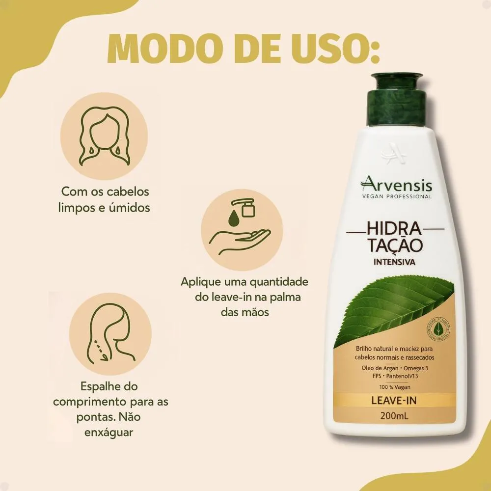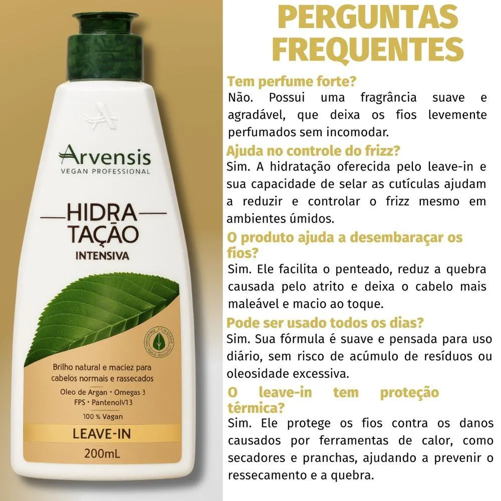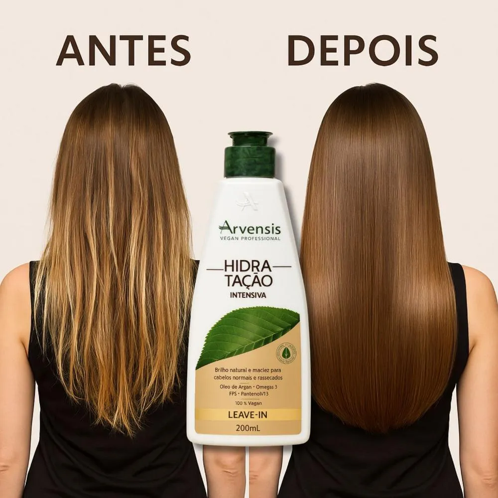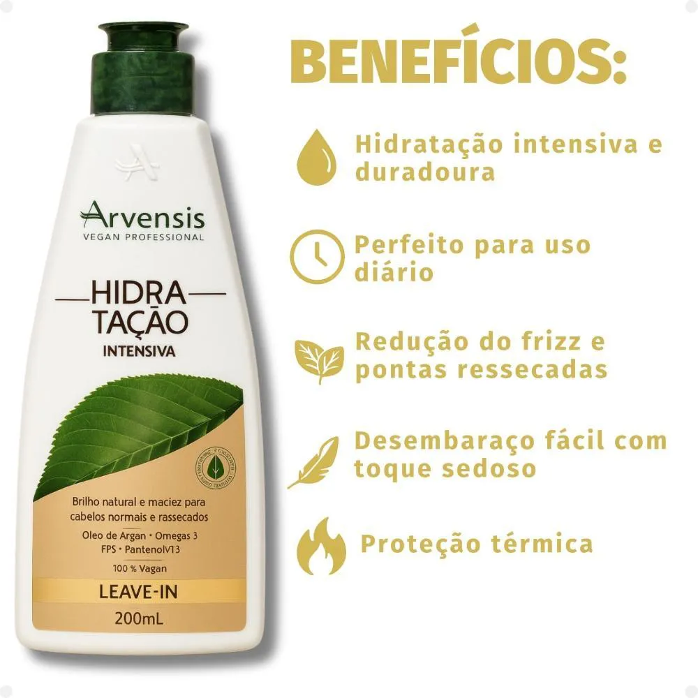Leave-In Arvensis Hidratação Intensiva 200ml O Leave-In Arvensis Hidratação Intensiva é um finalizador sem enxágue que oferece hidratação profunda, proteção e controle diário para cabelos secos, ressecados ou danificados. Com textura leve e fácil de espalhar, ele desembaraça os fios, reduz o frizz e sela as cutículas sem pesar, deixando os cabelos mais macios, brilhosos e com toque sedoso desde a primeira aplicação. Sua fórmula é enriquecida com ativos hidratantes e nutritivos que criam uma camada protetora ao redor dos fios, ajudando a manter a umidade natural, proteger contra as agressões externas e prevenir o ressecamento. Ideal para quem usa secador, chapinha ou babyliss, o produto também oferece proteção térmica, ajudando a manter os cabelos saudáveis mesmo com o uso frequente de calor. Versátil e prático, o Leave-In pode ser aplicado nos fios úmidos ou secos, proporcionando resultados imediatos com leveza e movimento.