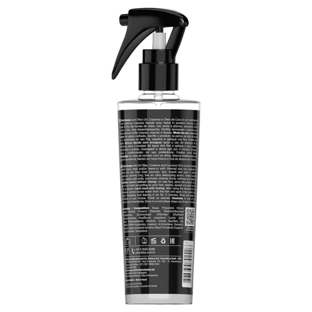 Indicado para todos os tipos de cabelos, especialmente os que necessitam de nutrição, proteção térmica e controle do frizz, oferecendo tratamento completo em uma fórmula multifuncional. O Leave-in Felps Uniq Cream 230ml reúne 9 benefícios em um único produto, que incluem hidratação imediata, brilho intenso, maciez, desembaraço fácil, reparação da fibra, ação antifrizz, proteção térmica, fortalecimento e prevenção de pontas duplas.Sua composição é enriquecida com proteínas, aminoácidos e agentes condicionantes que restauram a saúde capilar e criam uma película protetora ao redor dos fios, garantindo resistência e vitalidade por mais tempo. A textura leve não pesa nos cabelos e proporciona acabamento suave, sedoso e natural, sendo ideal para uso diário ou antes do secador, chapinha e modeladores.Modo de uso: