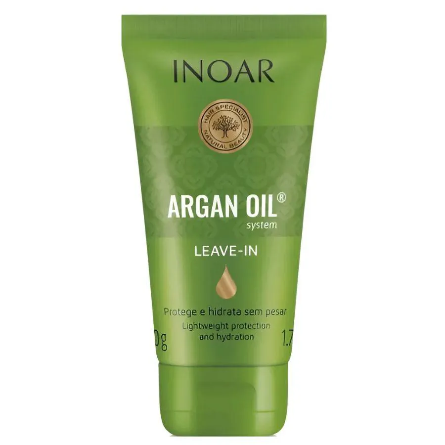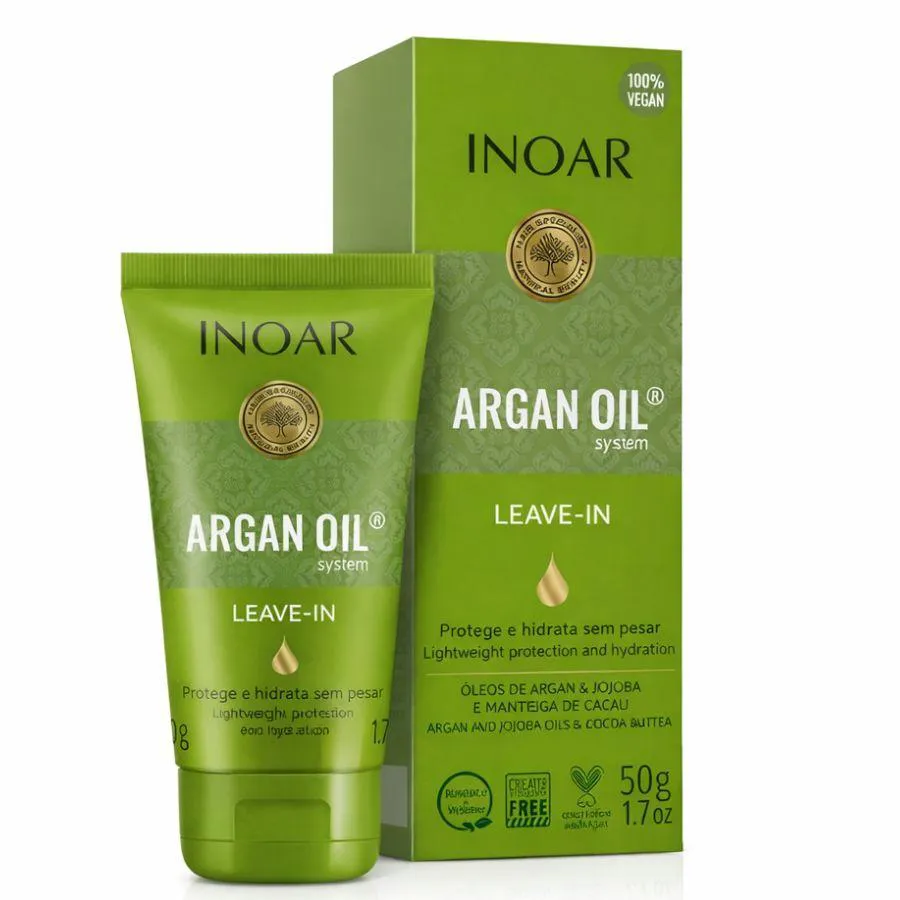 Inoar Argan Oil System 50g Leave-in para todos os tipos de cabelo. Inoar Argan Oil System protege os fios enquanto proporciona leveza e maleabilidade. Leave-in Inoar Argan Oil System impede a formação de frizz, garante brilho extremo e reduz o volume. Além disso, conta com fórmula botânica, sem ingredientes de origem animal, que oferece hidratação e outros inúmeros benefícios ao cabelo. Conselho de Aplicação Coloque uma pequena quantidade do leave-in nas palmas das mãos e aplique-a sobre o cabelo úmido. Espalhe massageando cuidadosamente os fios até as pontas. Não precisa de enxágue.