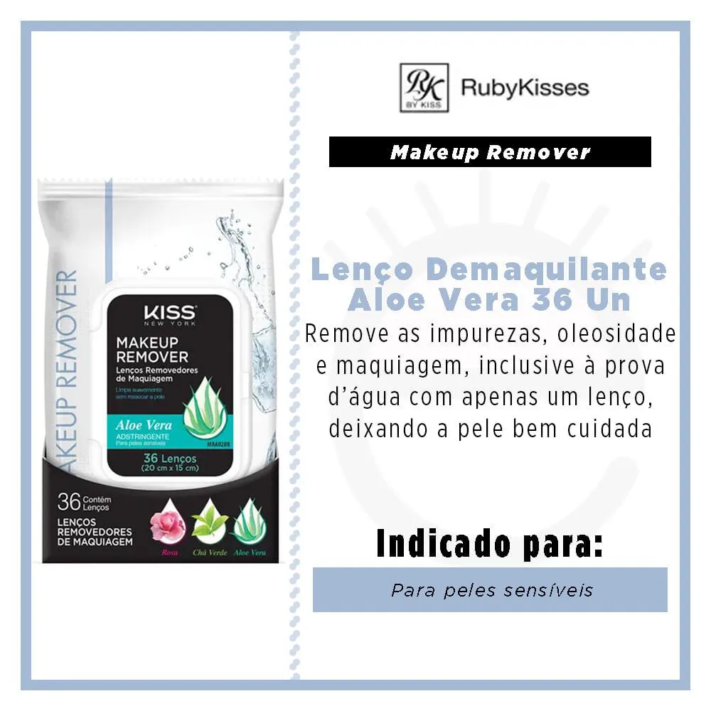 O Lenço demaquilante Aloe Vera da Ruby Kisses remove profundamente a maquiagem dos poros. Os lenços removedores de maquiagem da Kiss NY são de textura ultra macia e é recomendado até para a área delicada dos olhos.