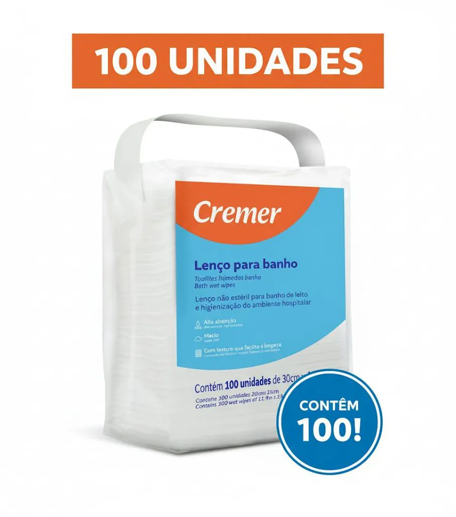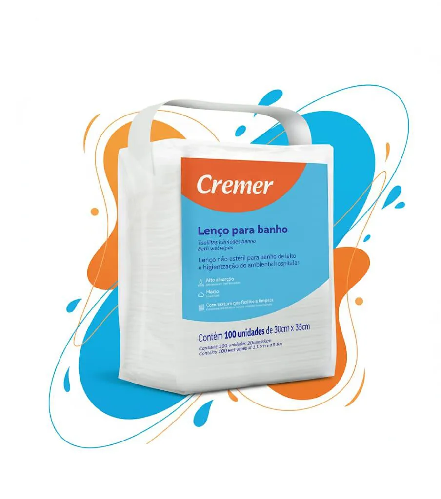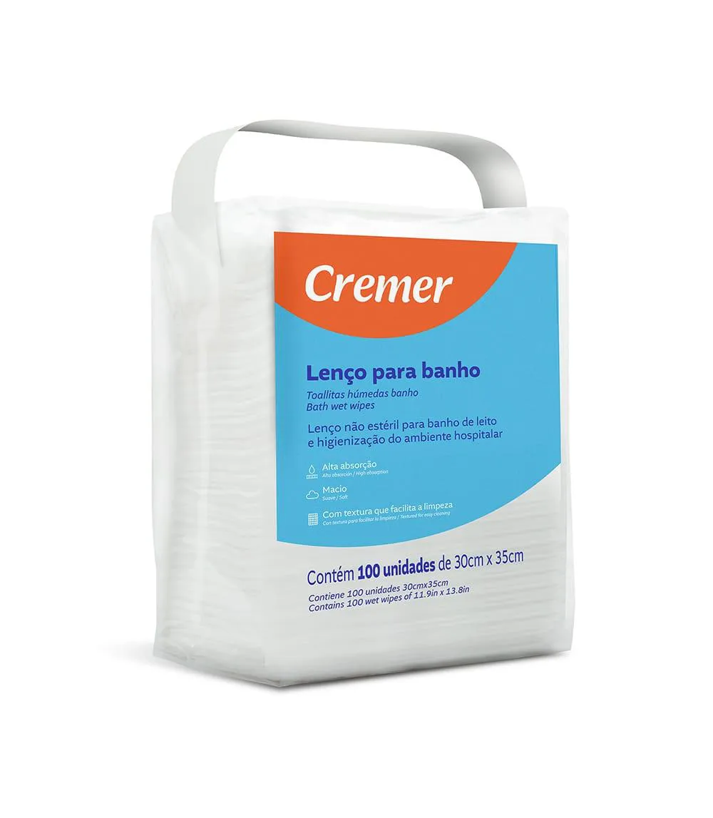 LENÇO PARA banho 100 UNIDADES CREMER 30 CM X 35 CM Trazemos a solução para você que procura um aliado na hora de higienizar o seu paciente , o lenço para banho Cremer. Desenvolvido com os materiais certos para você realizar a higienização adequada para o paciente que está em casa ou no ambiente hospitalar. Pensado para facilitar o cuidado diário, é a solução para você cuidador da melhor forma. O produto se destaca por ser feito com materiais de Alta Qualidade , além de ter uma alta absorção e uma textura que facilita a limpeza. Composição : 65% viscose e 35% poliester Gramatura 65g/metro quadrado . Armazenamento: Manter em local seco e ao abrigo do sol O fabricante recomenda uso único. Por que escolher a Cremer ? Alta absorção :Sua composição garante uma limpeza eficiente , absorvendo a sujeira e liquidos com eficácia. Macio e suave: Proporciona um toque delicado, ideal para peles sensiveis e uso prolongado; Textura especial: A textura facilita a remoção de residuos,tornando a limpeza mais rápida e fácil; Tamanho ideal : Com 30 cm x 35 cm o lenço oferece uma área ampla para uma higienização completa; Não estéril: Perfeito para a rotina de higiene de pacientes e a manutenção da limpeza em diversos ambientes ;