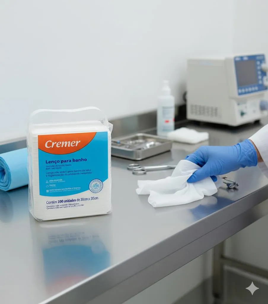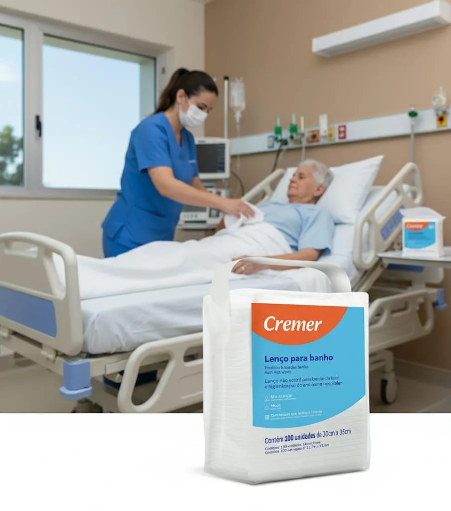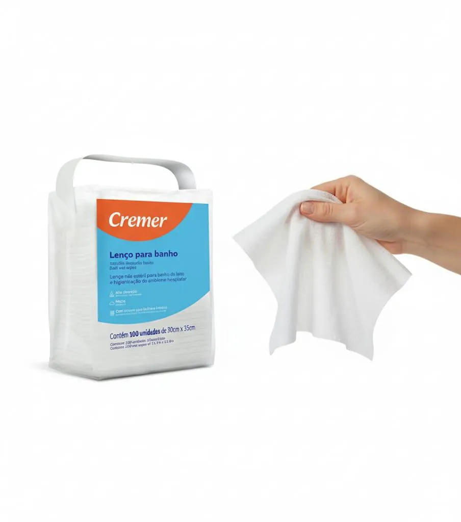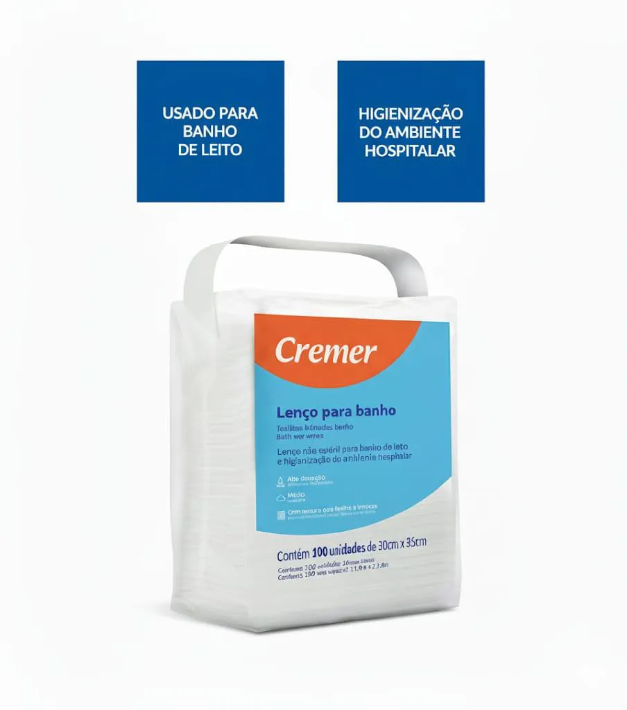 LENÇO PARA banho 100 UNIDADES CREMER 30 CM X 35 CM Trazemos a solução para você que procura um aliado na hora de higienizar o seu paciente , o lenço para banho Cremer. Desenvolvido com os materiais certos para você realizar a higienização adequada para o paciente que está em casa ou no ambiente hospitalar. Pensado para facilitar o cuidado diário, é a solução para você cuidador da melhor forma. O produto se destaca por ser feito com materiais de Alta Qualidade , além de ter uma alta absorção e uma textura que facilita a limpeza. Composição : 65% viscose e 35% poliester Gramatura 65g/metro quadrado . Armazenamento: Manter em local seco e ao abrigo do sol O fabricante recomenda uso único. Por que escolher a Cremer ? Alta absorção :Sua composição garante uma limpeza eficiente , absorvendo a sujeira e liquidos com eficácia. Macio e suave: Proporciona um toque delicado, ideal para peles sensiveis e uso prolongado; Textura especial: A textura facilita a remoção de residuos,tornando a limpeza mais rápida e fácil; Tamanho ideal : Com 30 cm x 35 cm o lenço oferece uma área ampla para uma higienização completa; Não estéril: Perfeito para a rotina de higiene de pacientes e a manutenção da limpeza em diversos ambientes ;