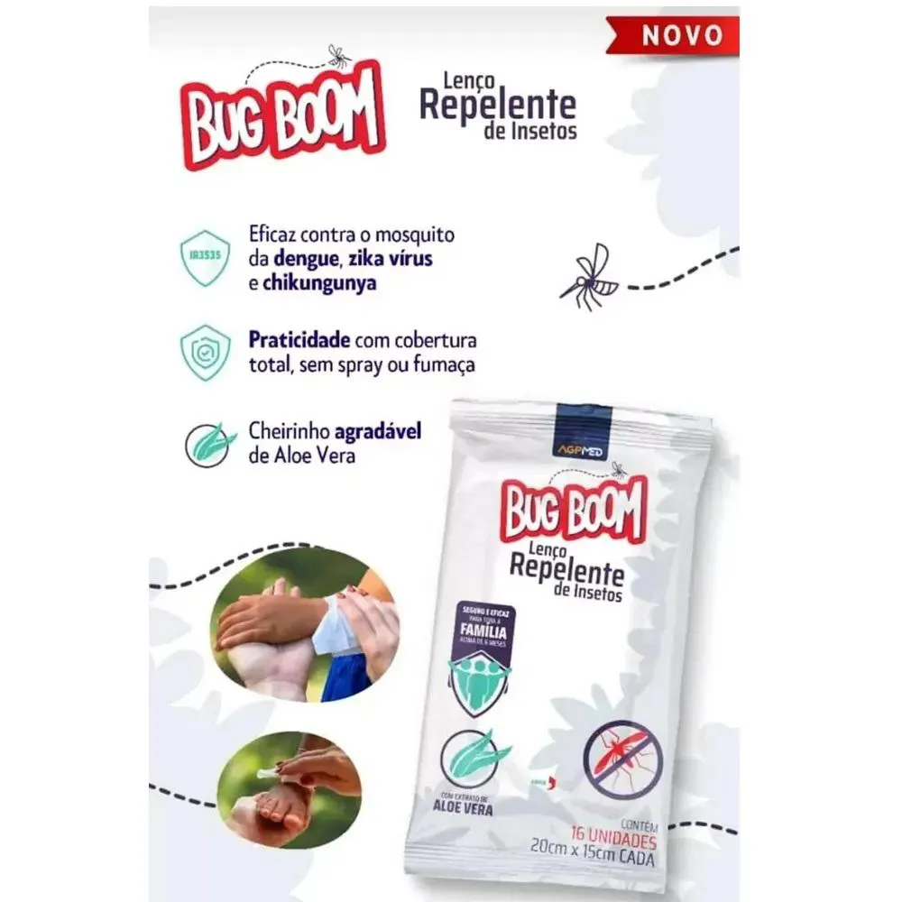 O lenço repelente Bug Boom da AGPMED é eficaz contra o mosquito transmissor da dengue, zika vírus e chikungunya. Ele garante proteção por até 4 horas e praticidade com cobertura total, sem spray ou fumaça!