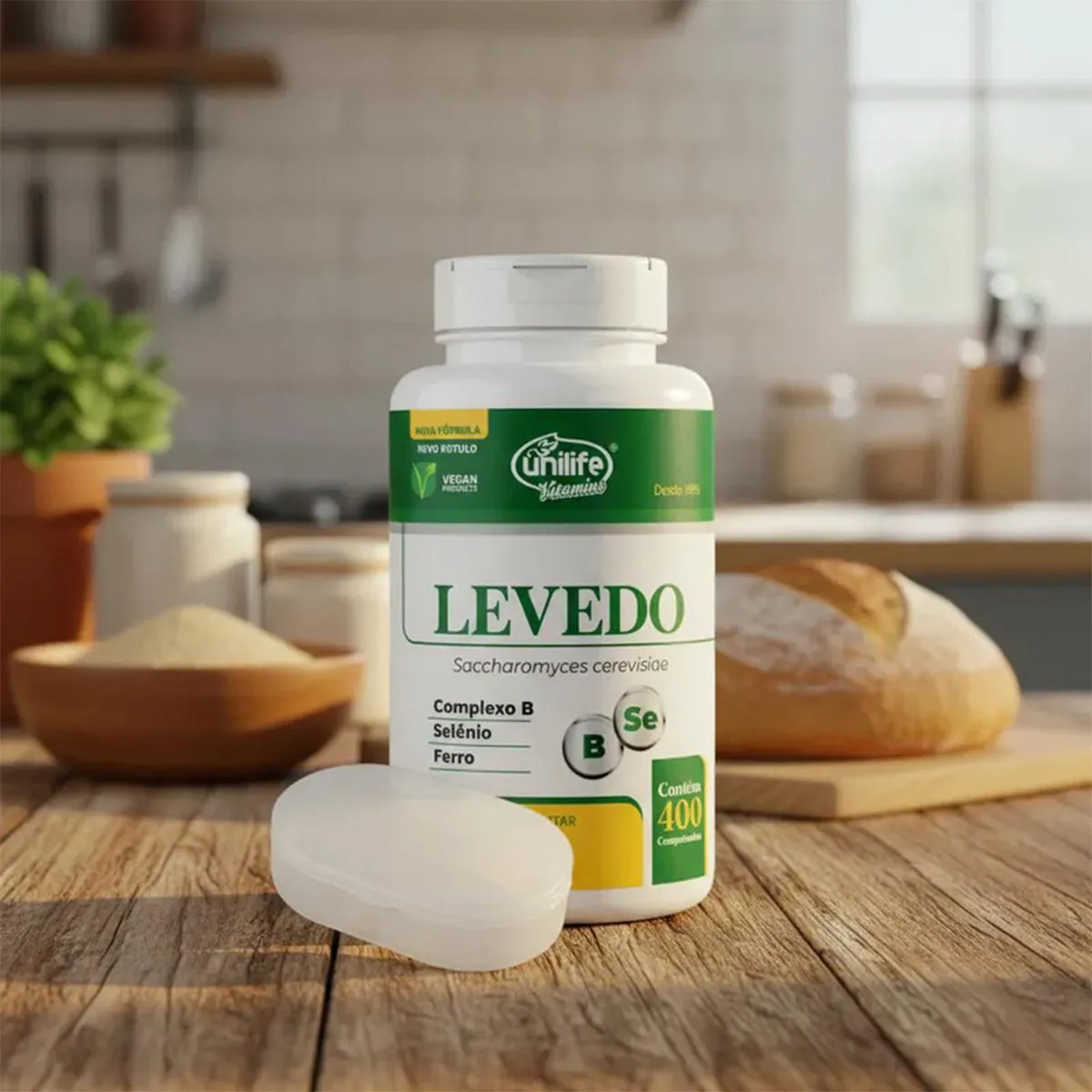 Suplemento alimentar em comprimidos composto por levedo de cerveja (Saccharomyces cerevisiae) com adição de vitaminas do complexo B. Embalagem conforme apresentação do fabricante. Produto destinado a maiores de 19 anos.