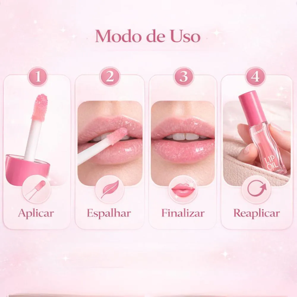 Aplique o lip oil diretamente sobre os lábios limpos e secos. Utilize o aplicador para espalhar o produto de maneira uniforme, garantindo uma cobertura completa. Pode ser usado sozinho para um efeito natural e hidratado, ou sobre o batom para um brilho extra e duradouro. Reaplique sempre que sentir necessidade, especialmente em climas secos ou após comer e beber.Anvisa: 25351.135480/2025-36