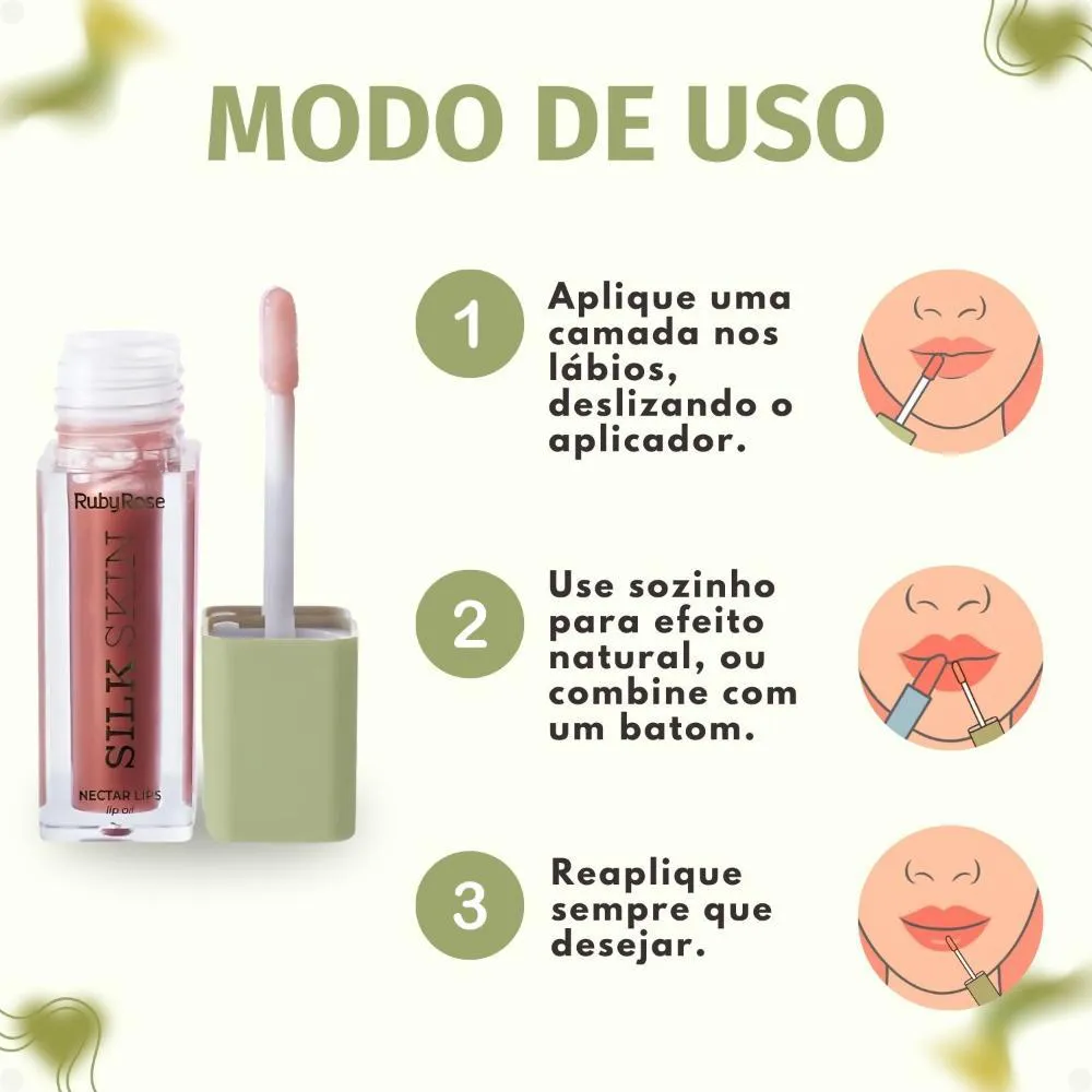 Aplique uma camada uniforme do Lip Oil Ruby Rose Silk Skin Nectar Lips Espresso Luxe diretamente nos lábios, deslizando o aplicador suavemente, começando pelo centro e seguindo para os cantos.Use sozinho para um look natural e hidratado, ou sobre o batom para um toque extra de brilho e hidratação, criando um efeito personalizado e sofisticado.Para melhores resultados, reaplique o produto sempre que sentir necessidade de hidratação ou desejar intensificar o brilho, mantendo os lábios sempre protegidos e radiantes.Anvisa: 25351.421036/2024-50