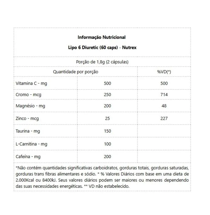 Lipo 6 Diuretic (60 caps) O Lipo 6 Diuretic da Nutrex é um suplemento diurético especialmente formulado para auxiliar na eliminação do excesso de líquidos retidos no corpo. Este produto é ideal para aqueles que buscam reduzir o inchaço e melhorar a definição muscular. Com uma composição à base de ingredientes naturais, o Lipo 6 Diuretic é uma escolha segura e eficaz para quem deseja obter uma silhueta mais definida e uma sensação de leveza.
