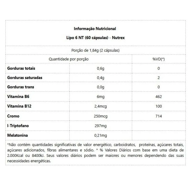 Lipo 6 Night Time (60 caps) É um novo conceito em suplemento pois atua direto sobre o metabolismo noturno. A noite, algumas pessoas tem forte tendência a acumular mais gordura que o normal, pois a noite, o metabolismo trabalha de forma mais lenta em geral. O LIPO 6 NIGHT TIME promove um sono mais profundo com um metabolismo mais esperto, ou seja, enquanto você dorme, ele trabalha para quebrar as gorduras mais rapidamente. Benefícios:* Modera o apetite;* Equilibra a insulina;* Acelera o metabolismo;*Converte gordura em energia;* Induz ao sono profundo.