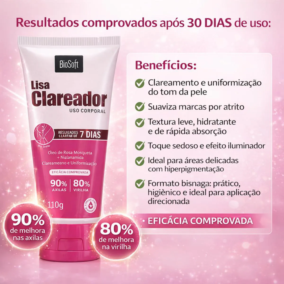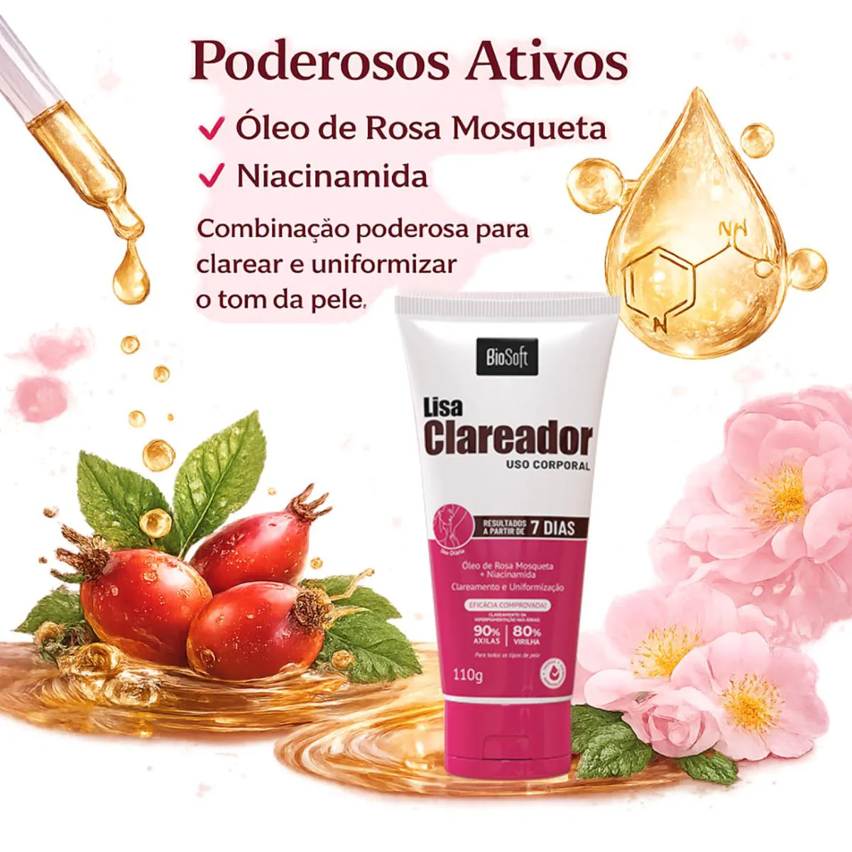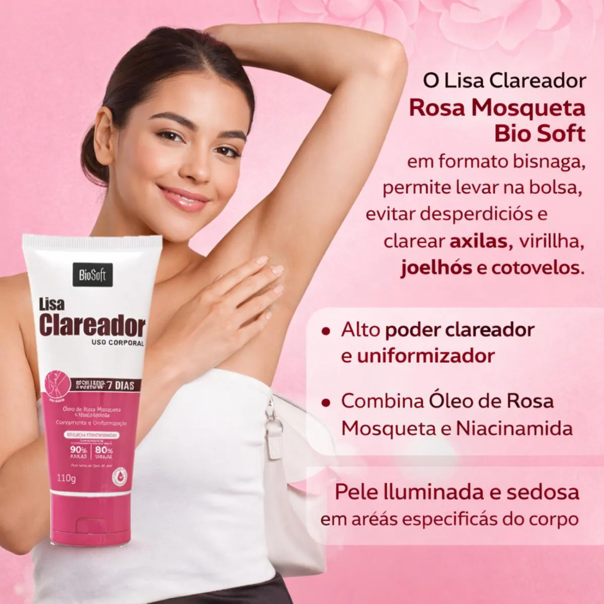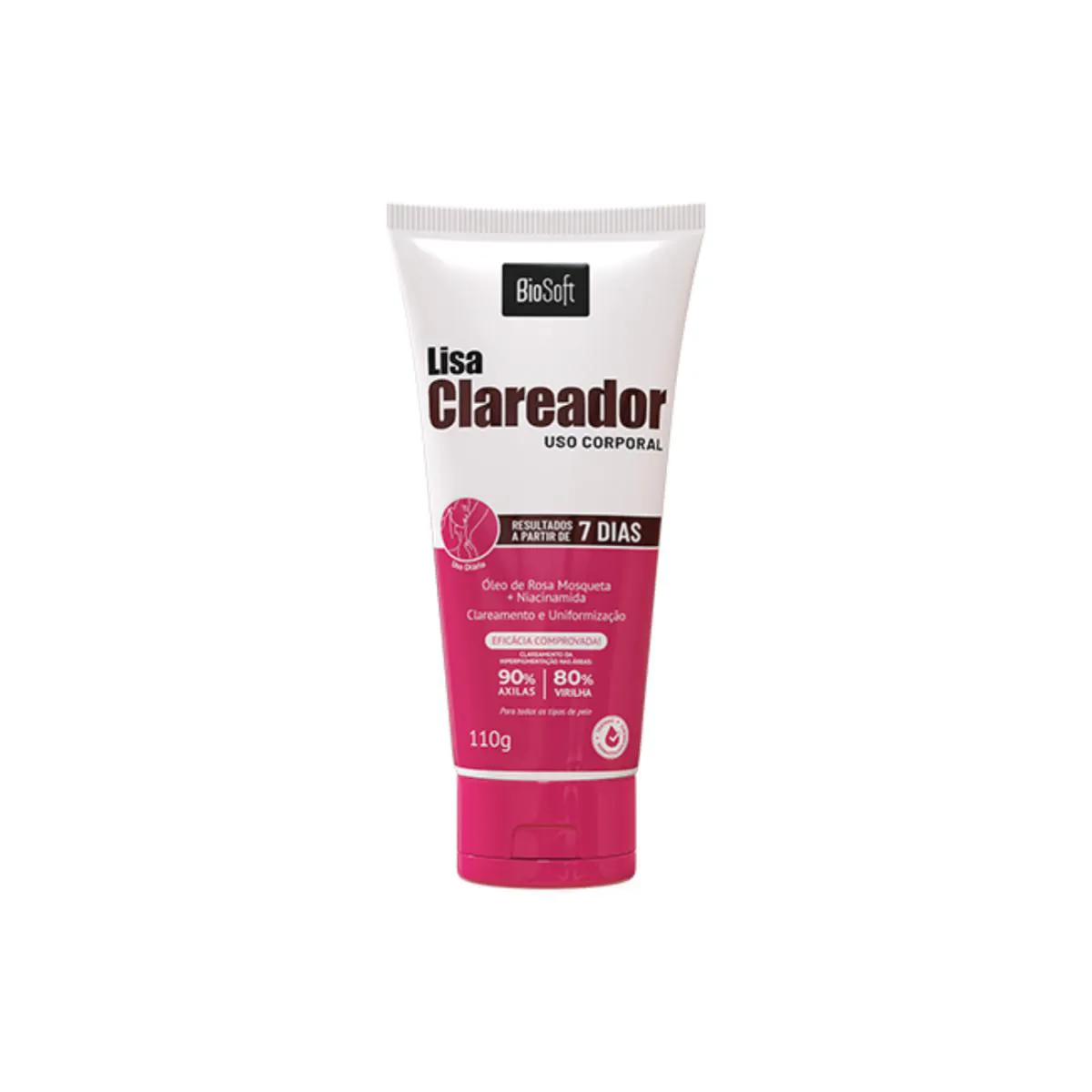 clareador de axilas, clareador de virilha, rosa mosqueta pele, niacinamida corporal, tira manchas atrito, lisa clareador bio soft, creme clareador bisnaga, uniformizador de tom, clareador joelhos, clareador cotovelos, hiperpigmentação, bio soft corporal, clareamento corporal, pele iluminada, clareador pos depilação.