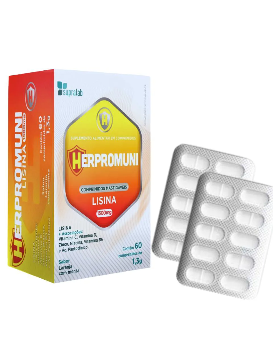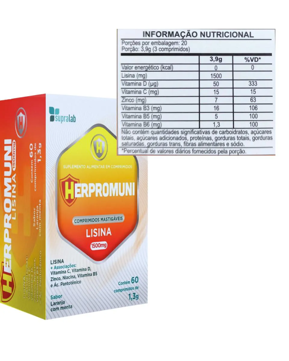 L-Lisina 1500mg + Vitaminas C, D, B5 e Zinco – No Herps60 Comprimidos mastigáveisSabor laranja com mentaIngredientes: Lisina, bisglicinato de zinco, niacina, vitamina c, vitamina B5, vitamina B6, vitamina D3.Recomendação de uso: Ingerir 3 comprimidos ao dia.Fortaleça sua imunidade e mantenha seu corpo protegido com uma fórmula completa! Este suplemento combina 1500mg de L-Lisina, um aminoácido essencial conhecido por ajudar no controle natural da herpes labial e genital, com vitaminas e minerais que potencializam a defesa do organismo:L-Lisina – Auxilia na prevenção e controle de surtos de herpes, além de promover a recuperação muscular e a saúde da pele.