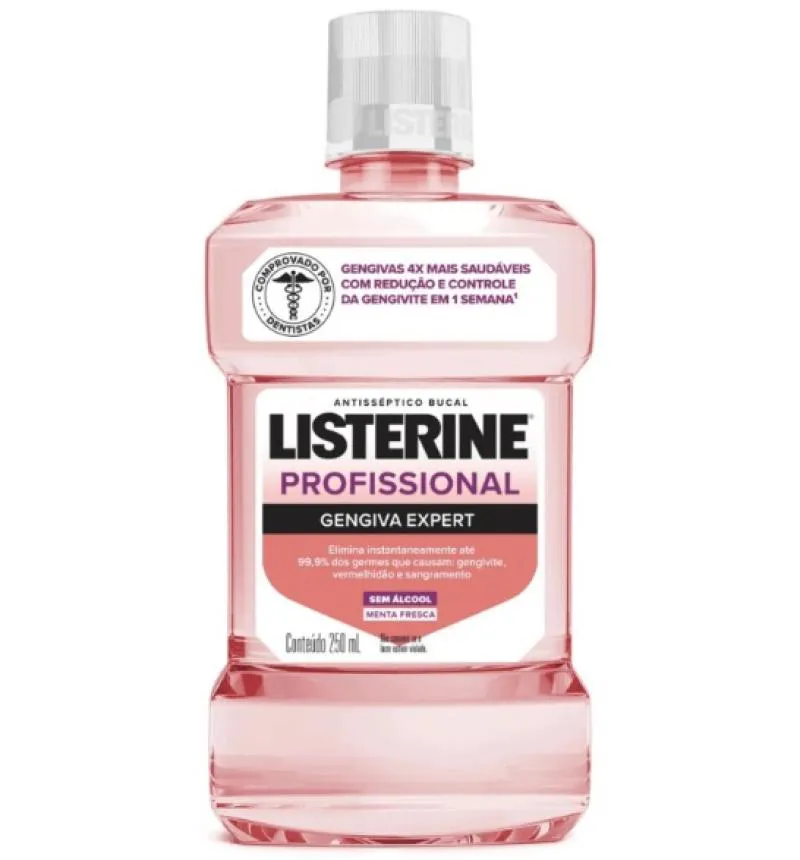 O Listerine Profissional Gengiva Expert é um enxaguante bucal especializado para cuidar das gengivas e prevenir problemas de saúde bucal. Sua fórmula com agentes antibacterianos e anti-inflamatórios ajuda a proteger as gengivas e a prevenir a gengivite. Benefícios: - Protege as gengivas: Ajuda a proteger as gengivas e a prevenir a gengivite. - Reduz a inflamação: Contém agentes anti-inflamatórios para reduzir a inflamação e o sangramento das gengivas. - Previne a placa bacteriana: Ajuda a prevenir a formação de placa bacteriana e a manter a saúde bucal. - Refrescância duradoura: Deixa a boca com uma sensação de refrescância duradoura. Modo de uso: 1. Enxague a boca com 20ml do produto por 30 segundos. 2. Cuspa o líquido e não engula. 3. Não enxágue a boca com água após o uso. 4. Use duas vezes ao dia, após a escagem dos dentes. Conteúdo: 250ml Precauções: - Uso externo apenas. - Não engula. - Mantenha fora do alcance de crianças. - Se ocorrer irritação, interrompa o uso e consulte um dentista. Apresentação: Frasco de 250ml com tampa de rosca.