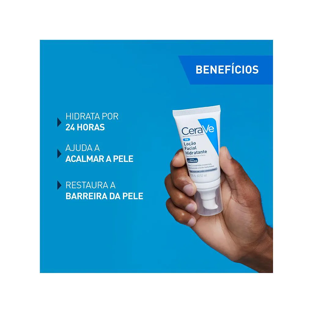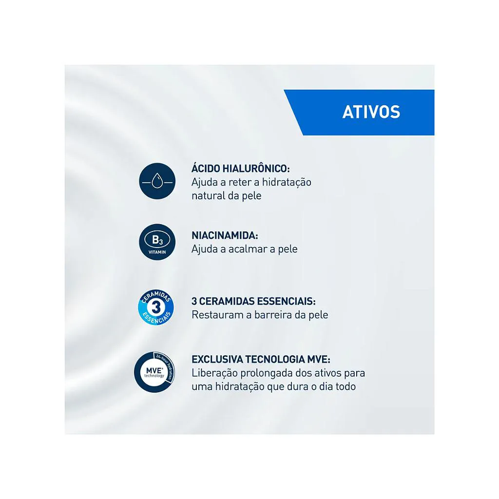 - A Loção hidratante Facial CeraVe é um cuidado diário desenvolvido com tecnologia MVE® de liberação prolongada, que garante hidratação contínua e duradoura ao longo do dia. Sua fórmula é enriquecida com três ceramidas essenciais, niacinamida e ácido hialurônico, ativos que ajudam a restaurar a barreira natural da pele, acalmar irritações e reter a umidade por até 24 horas, deixando a pele macia, suave e com aparência saudável.