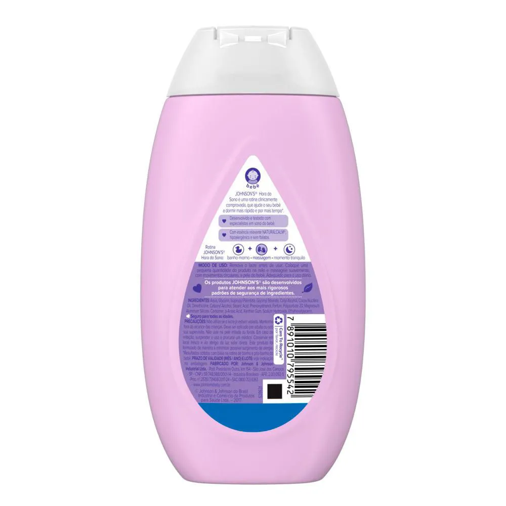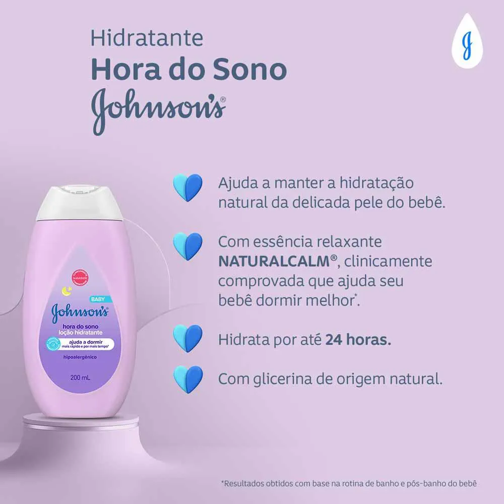 Com um cheirinho suave, proporciona uma pele delicadamente perfumada. Use como parte da nossa rotina JOHNSON’S® Hora do Sono de 3 passos: banho morno, seguido de uma massagem relaxante e um momento tranquilo. A linha é hipoalergênica, livre de corantes (exceto sab. Barra), parabenos, sulfatos e ftalatos. Além disso, é testado por dermatologistas, hipoalergênico e seguro desde o primeiro dia de vida.