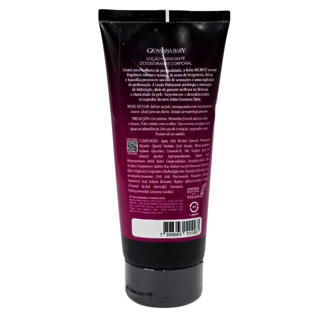 Finalidade: Criada para mulheres de personalidade, a linha Secrets possui fragrância intensa e sensual. As notas de bergamota, frésia e baunilha promovem um mix de sensações e uma explosão de perfumação. A Loção Hidratante prolonga a sensação de hidratação, além de garantir melhora na firmeza e elasticidade da pele. Experimente e descubra todos os segredos da nova linha Giovanna Baby.