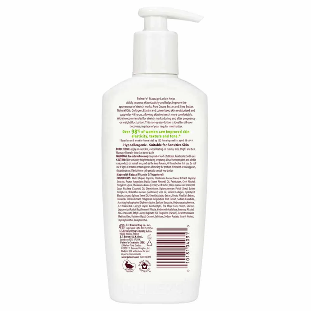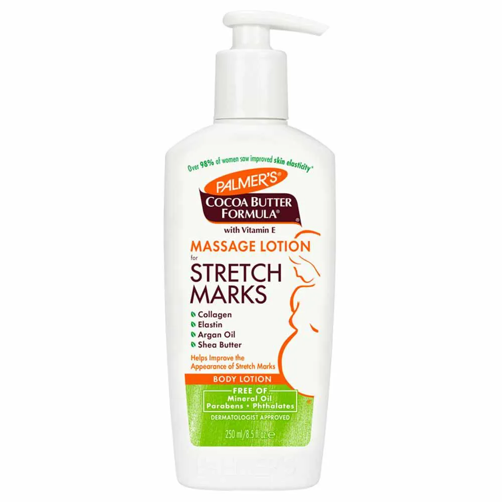 A Loção para estrias possui em sua fórmula manteiga de cacau Palmer que ajuda a reduzir a aparência de estrias com uma mistura especial de manteiga de cacau pura, vitamina e, manteiga de karité e Bio C-Elast e Bio C-Elast é uma poderosa combinação de colágeno, elastina, Centella Asiatica, óleo de amêndoa doce e óleo de argan. Esta loção não gordurosa, para todo o corpo, ajuda a melhorar a elasticidade e flexibilidade da pele alongada durante e após a gravidez. Também é recomendado para estrias associadas a flutuações de peso.