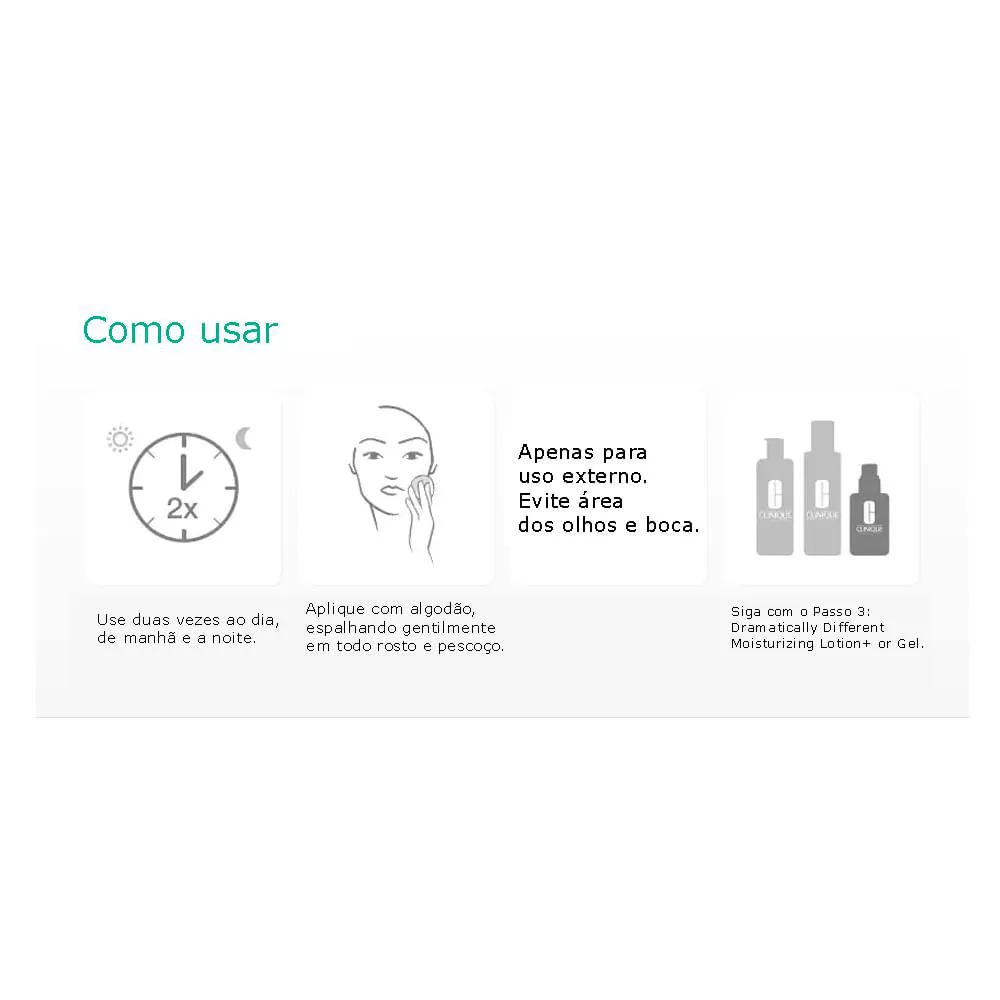 Aplique duas vezes ao dia, com a ajuda de um pedaço de algodão, no rosto e no pescoço e sempre com a pele limpa. Evite o contorno dos olhos e lábios. Sua utilização deve ser seguida pelo Dramatically Different Moisturizing Lotion.