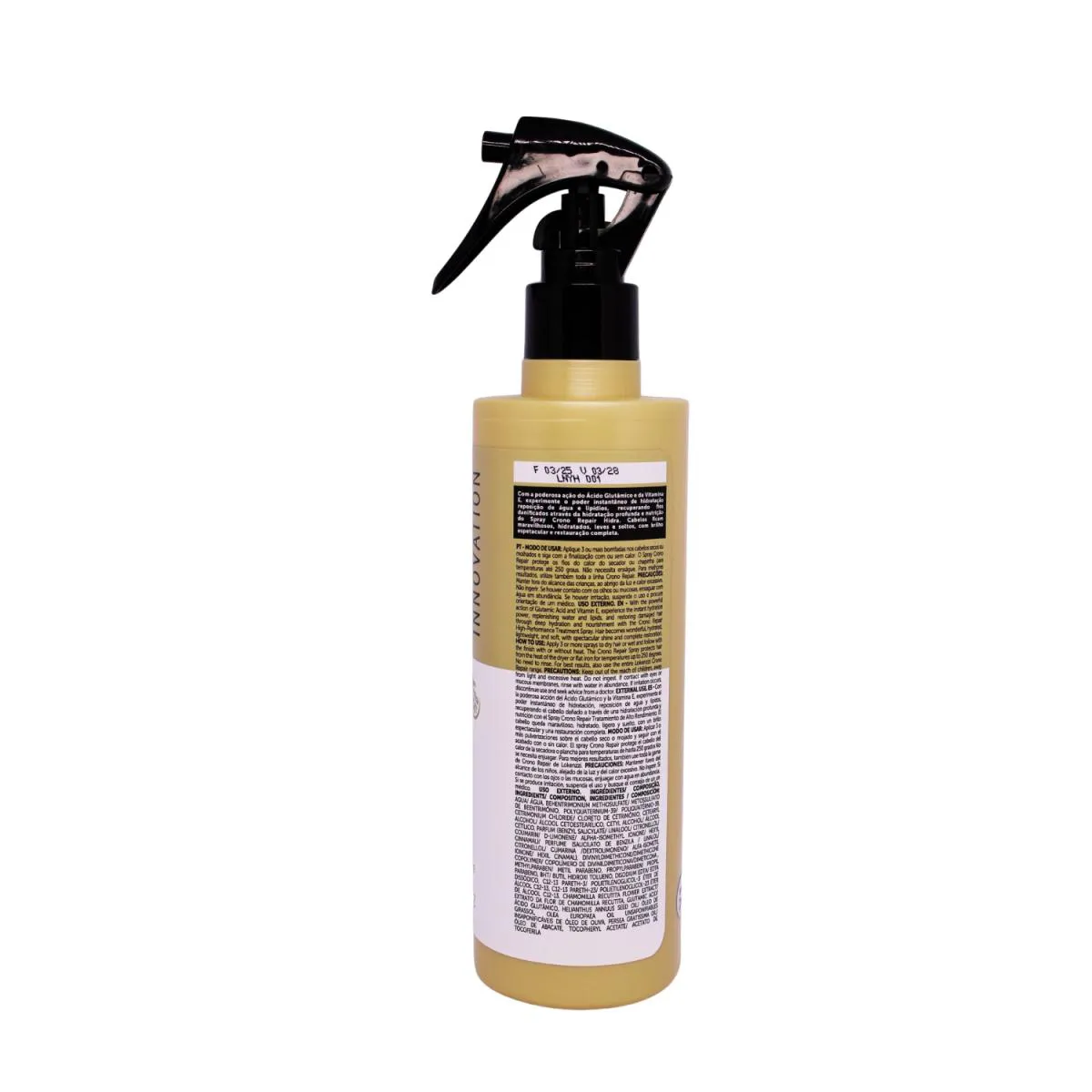 Ação poderosa do Ácido Glutâmico e da vitamina e, com poder instantâneo de hidratação, reposição de água e lipídeos, o Spray Crono Repair Hidra recupera os fios danificados através da hidratação profunda e nutrição dos fios. Resultando em cabelos hidratados, leves e soltos, com brilho espetacular e restauração completa. Com tecnologia inovadora, além de hidratar profundamente, o Spray Crono Repair Hidra protege os fios do calor do secador e da chapinha até 250°.