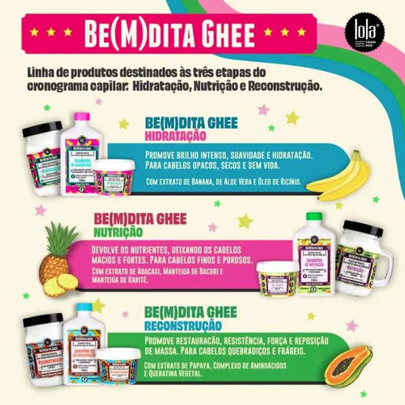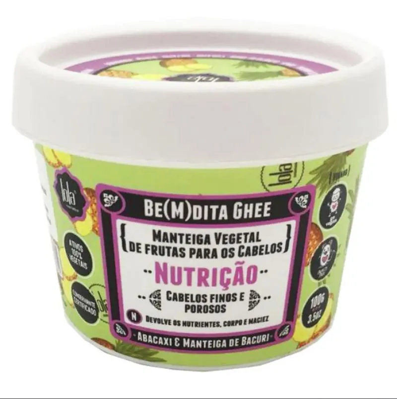 Um super produto que devolve os nutrientes, corpo e maciez dos seus fios! A Lola Cosmetics foi buscar na Índia a inspiração para a sua nova linha de cronograma capilar, que é mais que uma máscara! A Be(m)dita Ghee Abacaxi & Manteiga de Bacuri é uma Manteiga de Nutrição, vegetal de frutas, orgânica e vegana que devolve os nutrientes e proporciona aos fios corpo e maciez. Indicado para: • Para os cabelos finos e porosos. • Etapa de Nutrição do cronograma capilar Por que você vai amar? • Ideal para cronograma capilar • Liberada para Low e No Poo • Fragrância de óleos essenciais • Textura pronta para aplicação, não há necessidade de aquecer Ativos: • Abacaxi, manteigas de Bacuri e Cacau: que são remineralizantes e devolvem a fibra capilar os nutrientes que foram perdidos. Auxiliam no crescimento saldável dos fios, reparando a fibra capilar, além de nutrir e devolver maciez e brilho aos cabelos. • Água de Coco: Rica em aminoácidos, proporciona maciez e suavidade aos fios. O que é Ghee? Na Índia, o ghee é uma manteiga de uso cotidiano, considerada sagrada e celebrada como símbolo de auspiciosidade, nutrição e cura. É utilizado em diversas formulações medicinais e como óleo de massagem. Segundo a ayurveda, o ghee estimula a produção de Ojas, base da imunidade e a essência de todos os tecidos do corpo, promovendo renovação física e mental; aumenta a inteligência, refina o intelecto e melhora a memória. O ghee é queimado nos templos e pujas (rituais) por toda a Índia. Acredita-se que “a luz de uma chama ghee afasta toda a negatividade”. #édica de aplicação: Utilize de 2 a 3 colheres de chá, aplique nas mãos, emulsione para espalhar e aplique do comprimento às pontas, logo após o shampoo de sua preferência, evite aplicar diretamente na raiz. Deixe agir de 3 a 5 minutos. Retire todo o excesso. Não é necessário finalizar com condicionador. Use semanalmente ou quando se fizer necessário o processo de nutrição dos fios. A quantidade varia de acordo com o volume e comprimento de seus cabelos. Resultado: Seus cabelos muito mais fortes, brilhosos e incríveis! Lola Cosmetcs, uma empresa vegana: Você sabia que a Lola é uma empresa vegana que se preocupa com os animaizinhos desse mundo? Isso inclui sermos contra os testes em catiorríneos, gatíneos e outros bichíneos. #alolaamaosbichínenos A Marca: A Lola Cosmetics surgiu a partir de uma escolha: ser feliz! Levar a vida com bom humor, ainda que nada pareça dar certo. Nem mesmo o seu cabelo! Fazem o papel de levar até você sensações e cuidados especiais, cores vibrantes, textos motivadores e bem humorados, provocando um sentimento único e motivador! A Lola é uma empresa Vegana que se preocupa com os animaizinhos desse mundo, isso inclui serem contra testes em cachorros, gatos e outros bichinhos!