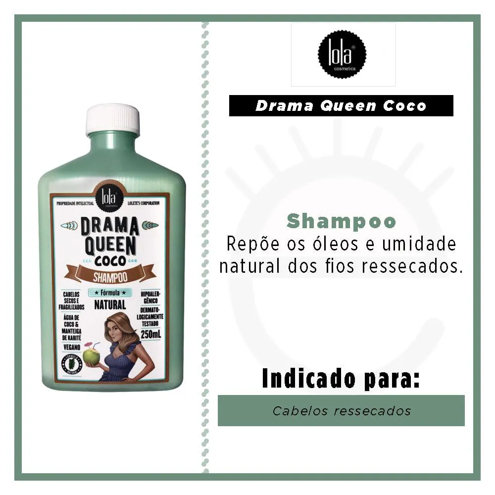 Drama Queen Coco é um shampoo nutritivo para cabelos secos e fragilizados. Reponho os óleos e umidade natural dos fios ressecados, recupero os nutrientes perdidos, devolvo maciez, brilho e flexibilidade.