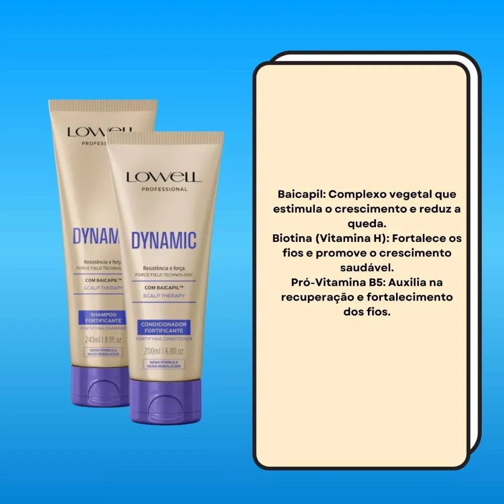 Lowell Dynamic Kit shampoo e condicionador Fortificante O Shampoo Fortificante Dynamic e Condicionador Fortificante Dynamic oferece hidratação profunda, desembaraço e fortalecimento dos fios. Sua fórmula contém Baicapil e Alpha Bisabolol, proporcionando ação anti-inflamatória e permitindo a aplicação desde a raiz até as pontas. Tipo de Cabelos: Com quedas e Ralos Benefícios: