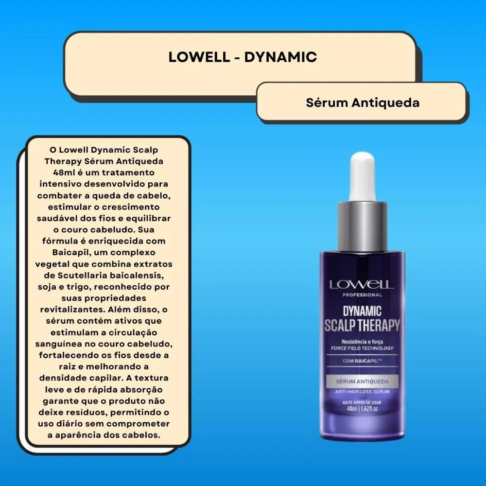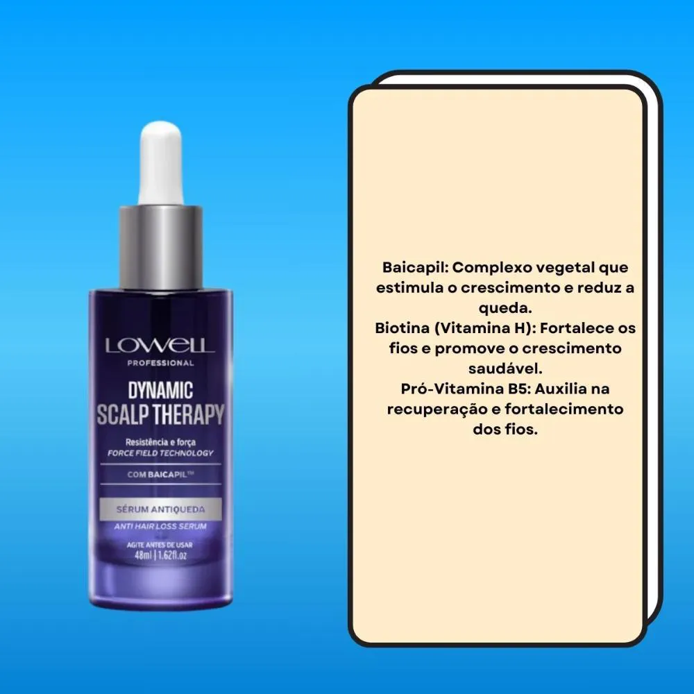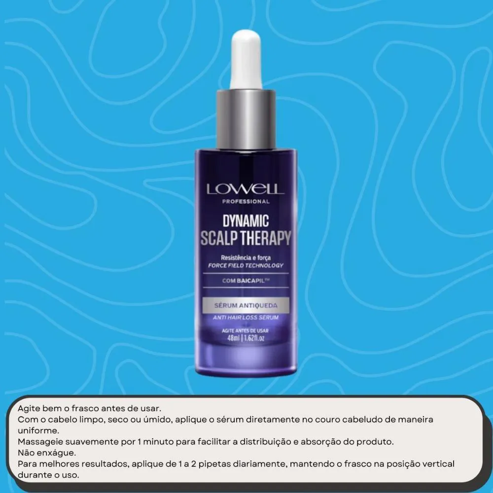 Lowell Dynamic Sérum antiqueda 48ml O Lowell Dynamic Scalp Therapy Sérum Antiqueda 48ml é um tratamento intensivo desenvolvido para combater a queda de cabelo, estimular o crescimento saudável dos fios e equilibrar o couro cabeludo. Sua fórmula é enriquecida com Baicapil, um complexo vegetal que combina extratos de Scutellaria baicalensis, soja e trigo, reconhecido por suas propriedades revitalizantes. Além disso, o sérum contém ativos que estimulam a circulação sanguínea no couro cabeludo, fortalecendo os fios desde a raiz e melhorando a densidade capilar. A textura leve e de rápida absorção garante que o produto não deixe resíduos, permitindo o uso diário sem comprometer a aparência dos cabelos.Tipo de Cabelos: Com quedas e Ralos
