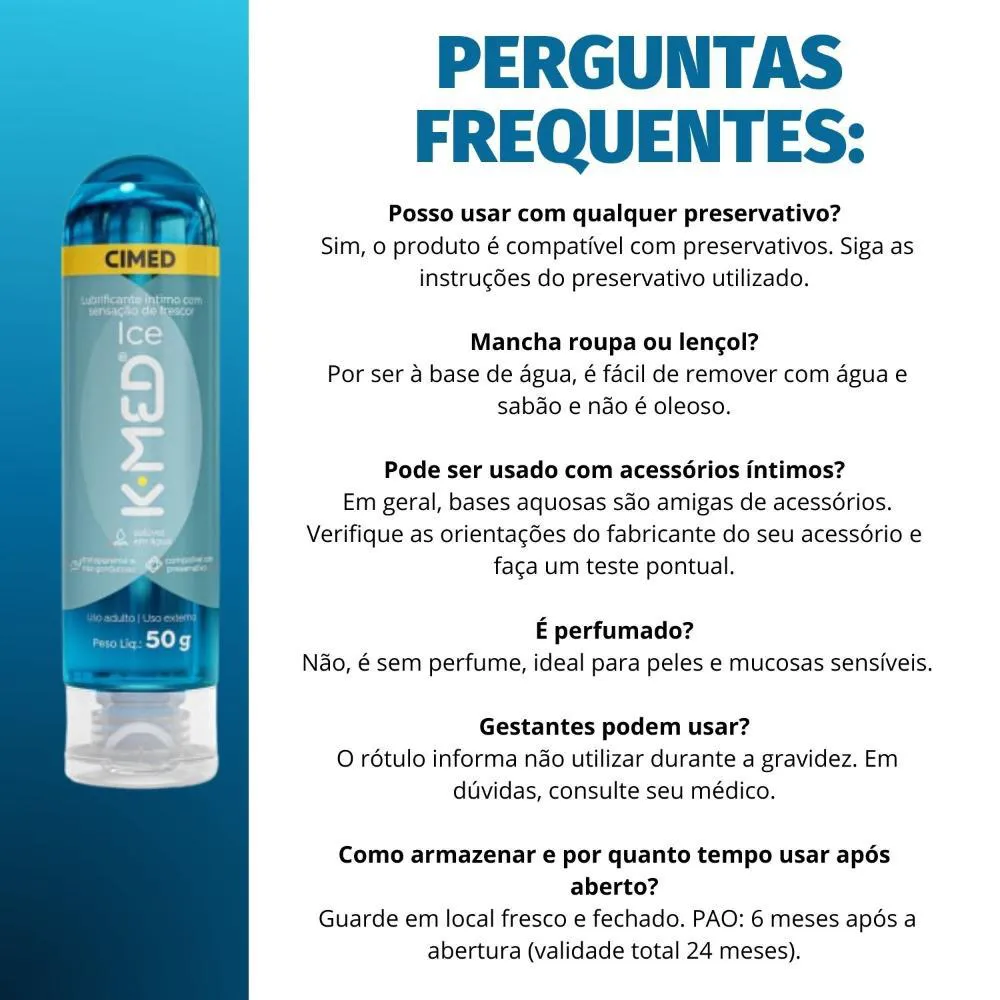 O produto é facilmente removível com água, garantindo praticidade após o uso.Mantenha o Lubrificante Íntimo Cimed K-Med Ice 50g em local fresco e seco, longe da luz solar direta, para preservar suas propriedades.Modo de Uso/Aplicação