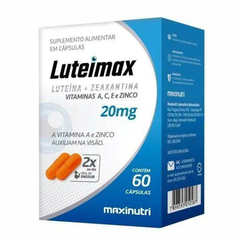 O Luteimax é um suplemento vitamínico natural completo que conta em sua composição com elementos variados e essenciais não somente para a saúde dos olhos, mas ainda para aumento da imunidade corporal e propriedade antioxidante. Dentre os principais componentes da fórmula do Luteimax estão a Luteína, Zeaxantina, Vitaminas A, E, C e Zinco. O produto é comercializado na internet de forma exclusiva pela natulha, vendido em frascos com 60 cápsulas cada, ideal para um mês de tratamento, uma vez que deve ser ingerido duas cápsulas diariamente antes do almoço e jantar para que o tratamento tenha a eficácia desejada. Benefícios: