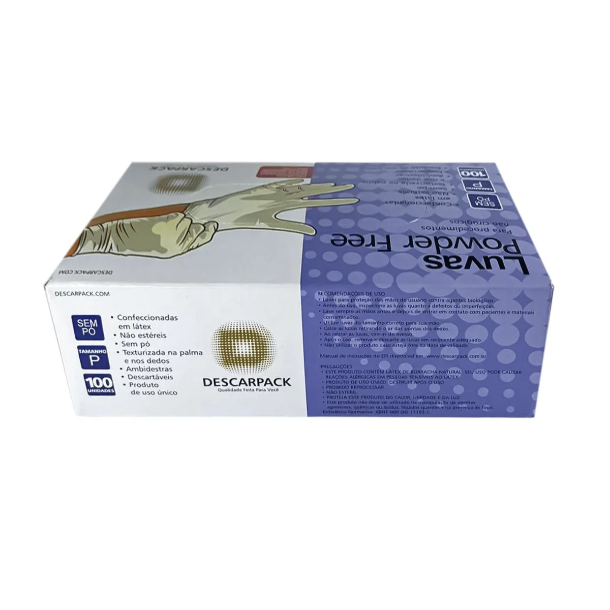 LUVA PARA PROCEDIMENTO NÃO CIRÚRGICO LÁTEX SEM PÓ DESCARPACK – POWDER FREE – COR BRANCO – CAIXA COM 100 UNIDADES A Luva para Procedimento Não Cirúrgico Látex Sem Pó Descarpack (Powder Free) é projetada para garantir segurança, conforto e higiene em ambientes que exigem alta proteção, como clínicas, hospitais e centros de estética. Fabricada em látex de qualidade superior, esta luva sem pó oferece uma barreira eficaz contra contaminantes, ideal para profissionais que buscam uma opção prática e hipoalergênica. Com design anatômico, essa luva proporciona um ajuste perfeito para mãos, oferecendo conforto e sensibilidade tátil necessária para atividades de precisão. A ausência de pó reduz o risco de irritações e alergias, tornando-a especialmente indicada para uso prolongado e para pessoas sensíveis ao látex com pó. A cor branca mantém uma aparência limpa e profissional, essencial em ambientes que prezam pela segurança e higiene. Cada caixa contém 100 unidades, garantindo uma ótima relação custo-benefício e praticidade para o uso frequente. Para assegurar a conformidade com as normas de segurança, a Luva Descarpack Sem Pó possui Registro ANVISA: 10330660303, comprovando que atende a todos os padrões e regulamentações exigidos pela Agência Nacional de Vigilância Sanitária. A Luva para Procedimento Não Cirúrgico Látex Sem Pó Descarpack é a escolha ideal para profissionais da saúde e estética que buscam qualidade, proteção e conforto em um produto Powder Free, essencial para o uso diário em diversas atividades.