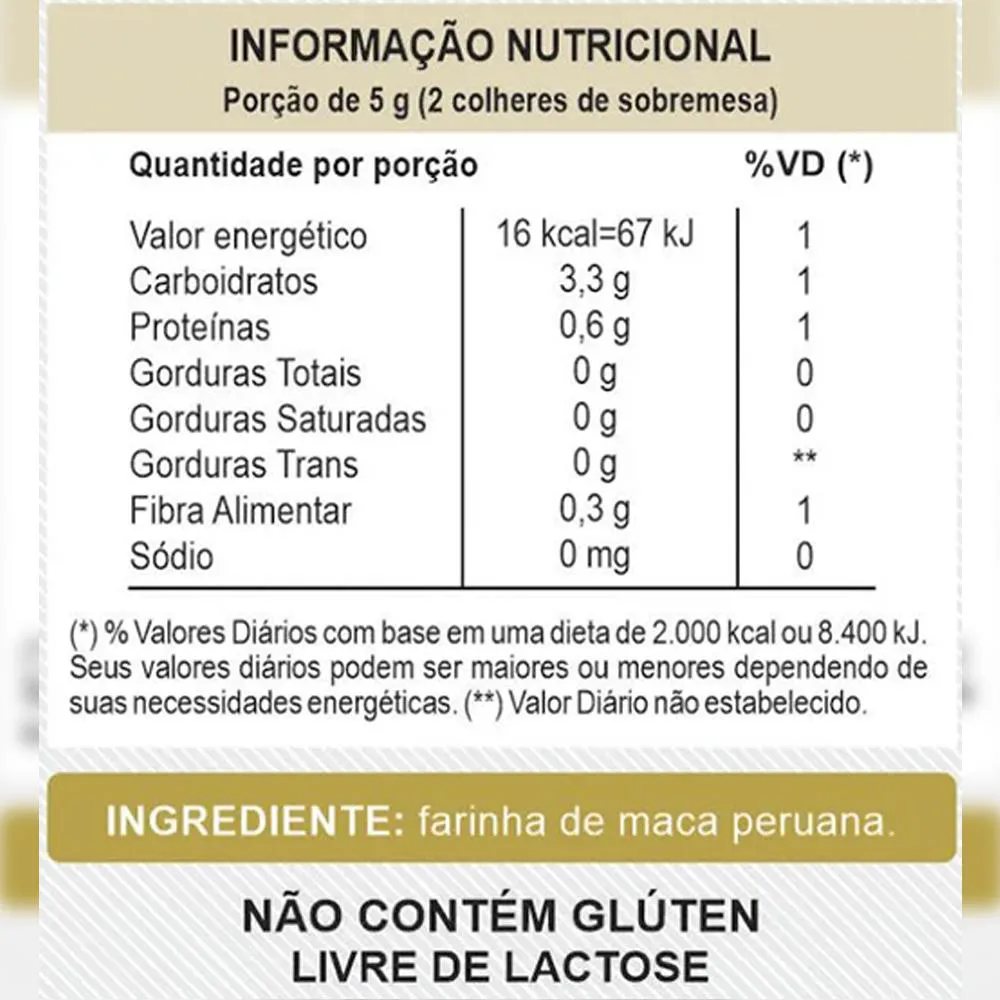 - Livre de Glúten. Modo de Uso: Sugere-se a ingestão de 1 colher de sobremesa (2,5g) 2 vezes ao dia. A farinha de maca Unilife Vitamins pode ser adicionada em sucos, vitaminas e iogurtes. Ingredientes: Farinha de Maca peruana. NÃO CONTÉM GLÚTEN. Avisos: - Este produto não é um medicamento.