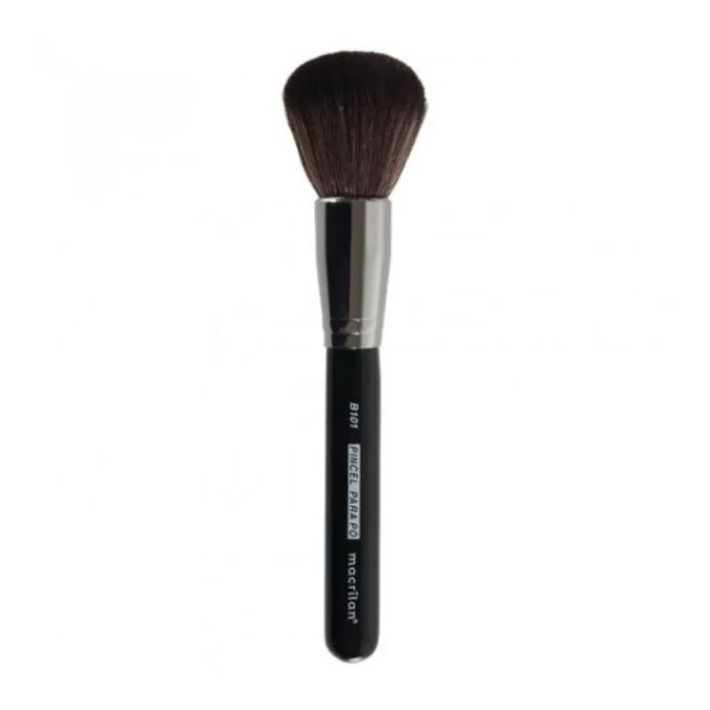 Pincel Macrilan B101, especialmente desenvolvido para aplicação de pó mineral, pó facial compacto, solto ou iluminador por toda a face e corpo. Feito com cerdas arredondadas e macias para uma aplicação suave e uma maquiagem uniforme.