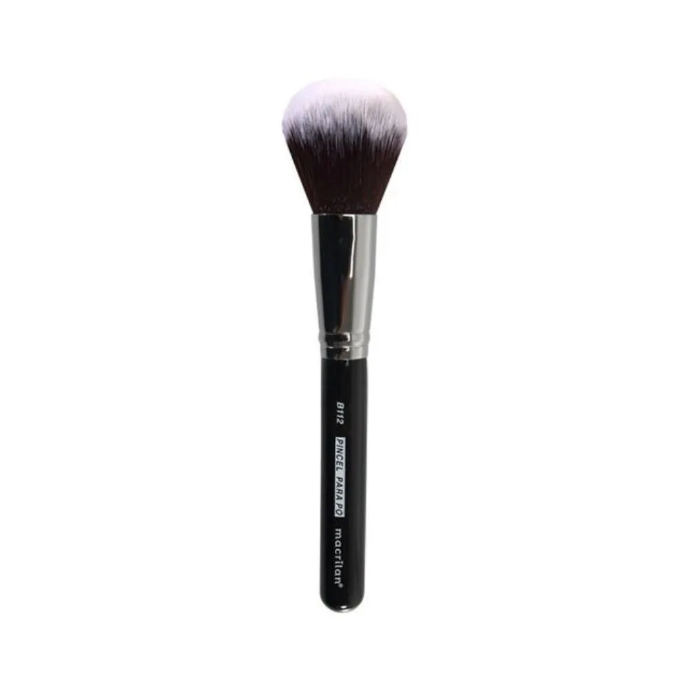 Pincel Macrilan B112, especialmente desenvolvido para aplicação de pó mineral, pó facial compacto, solto ou iluminador por toda a face e corpo. Feito com cerdas arredondadas e macias para uma aplicação suave e uma maquiagem uniforme.