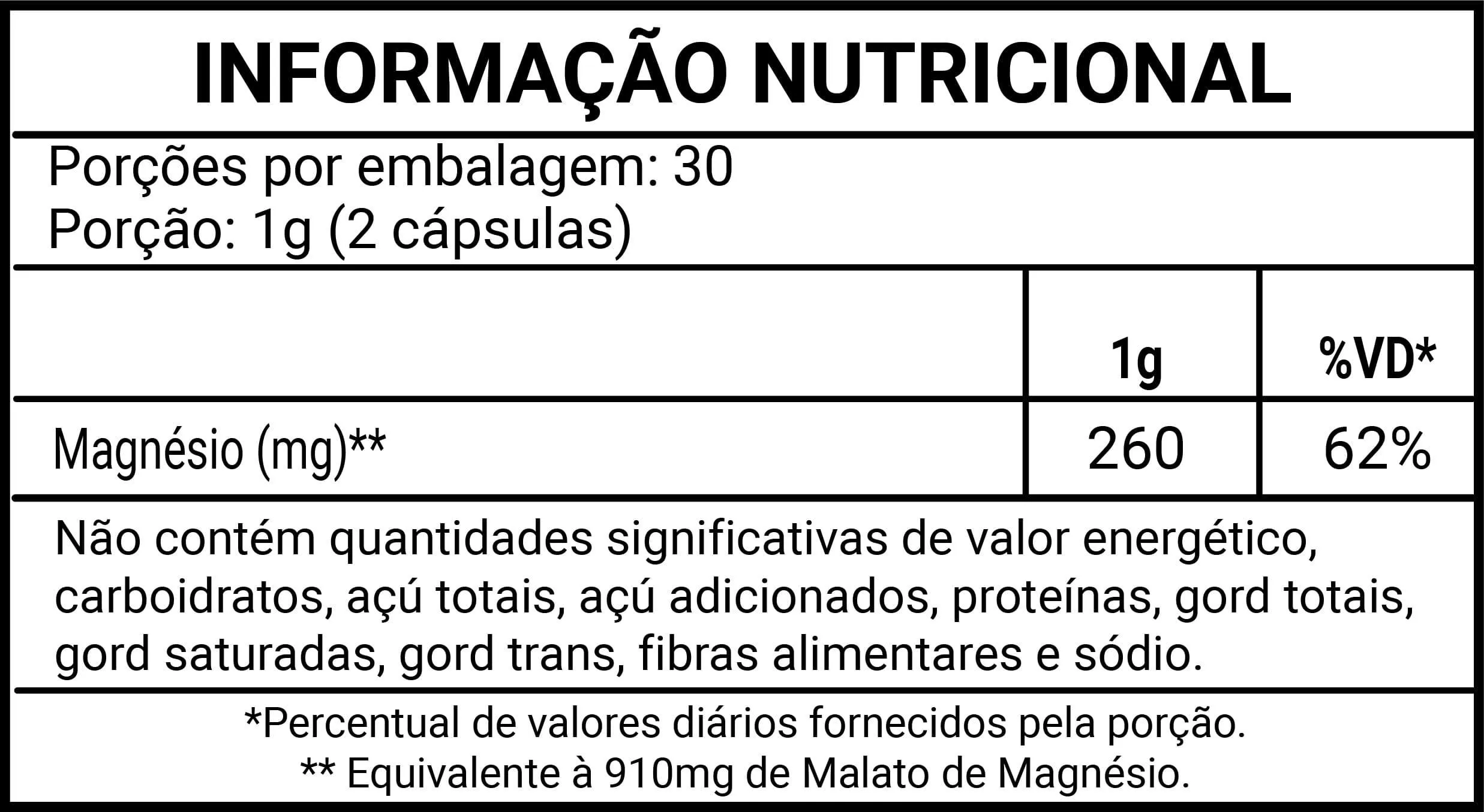 Magnésio dimalato e excipiente (amido de milho) e antiumectante (dióxido de silício).