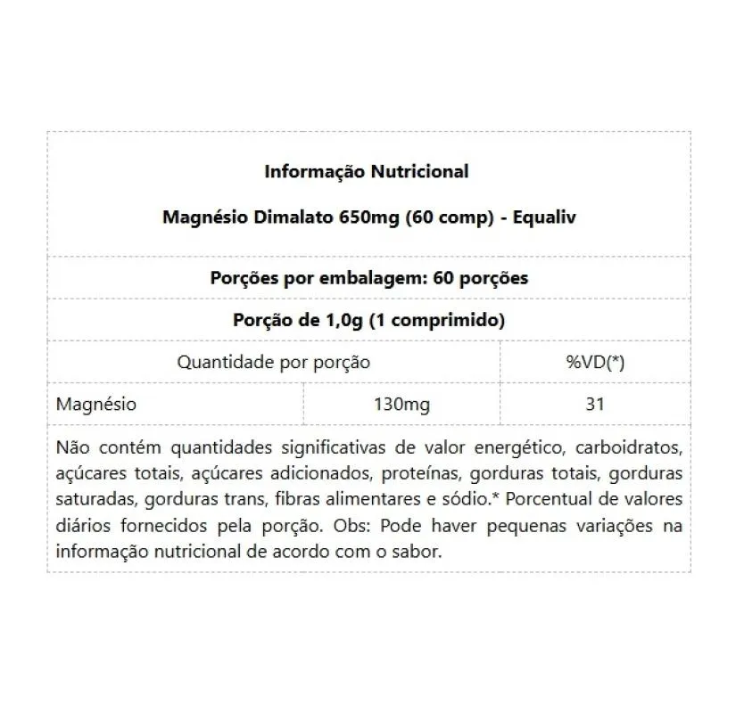 Magnésio Dimalato 650mg (60 comp) Equaliv Magnésio Dimalato é um mineral orgânico na forma mais assertiva para fornecer maior teor de magnésio. Trata-se de um nutriente essencial para a produção do Trifosfato de Adenosina (ATP), que é responsável pela energia do corpo. Equaliv Magnésio Dimalato é um facilitador para a atividade de mais de 600 enzimas, atuando sobre o processo de divisão celular e diversos sistemas do organismo. Contribui para o bom funcionamento dos sistemas muscular, articular, cardiovascular, nervoso e ósseo. Em especial, em casos como o de fibromialgia, o magnésio pode favorecer o relaxamento da musculatura, e a diminuição do estado de contração que provoca as dores. Benefícios: - Fonte de magnésio;- Auxilia no funcionamento neuromuscular;- Auxilia no metabolismo de proteínas, carboidratos e gorduras;- Auxilia na formação de ossos e dentes;- Biodisponível;- Sem glúten e sem lactose.