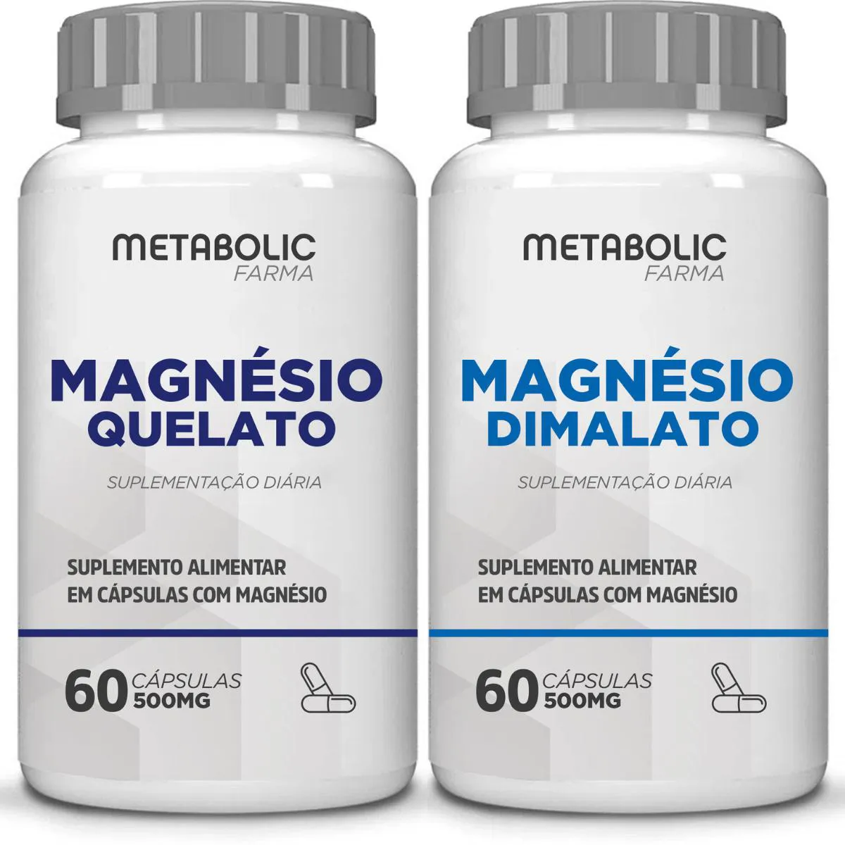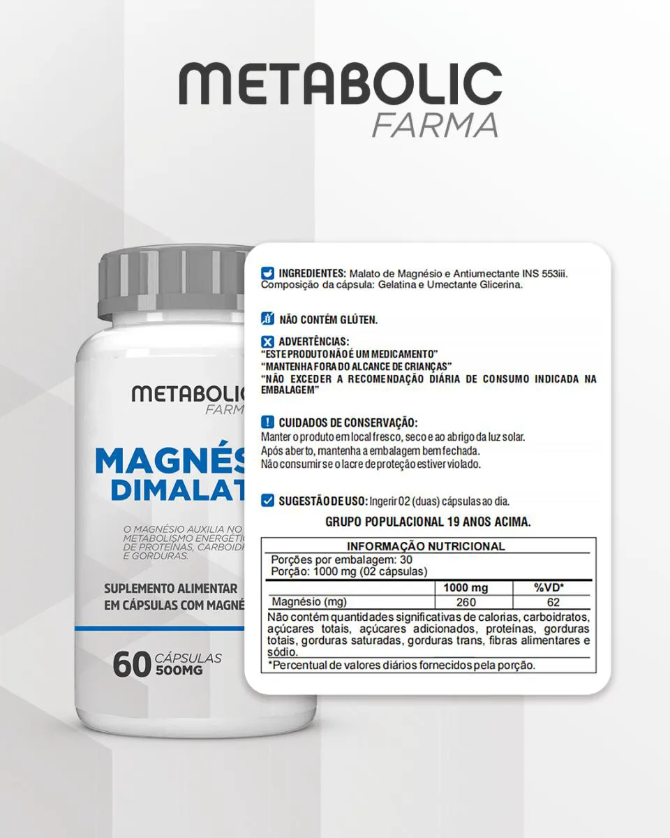 KIT  MAGNESIO QUELATO + MAGNESIO DIMALATO  - METABOLIC FARMA   MAGNESIO DIMALATO: Apresentação: Frasco com 60 cápsulas  Ingredientes: Magnesio Dimalato Dosagem Recomendada: 2 cápsulas ao dia Validade: 2 anos após a data de fabricação