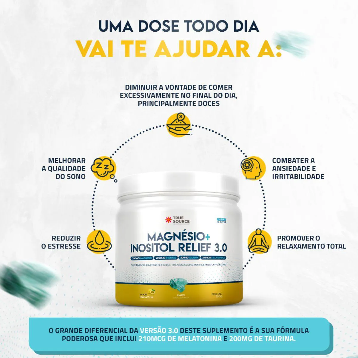 O Magnésio + Inositol Relief 3.0 350g True Source se integra a rotinas que priorizam suplemento funcional, vitaminas, minerais, nutrição equilibrada, rotina diária organizada, bem estar e escolhas conscientes. É uma alternativa prática e sofisticada para complementar dietas variadas com constância, qualidade e a assinatura técnica que distingue a True Source no universo da suplementação.