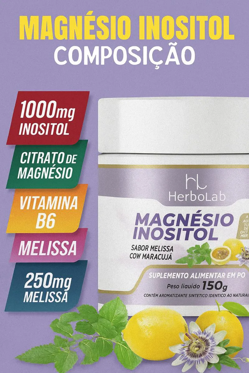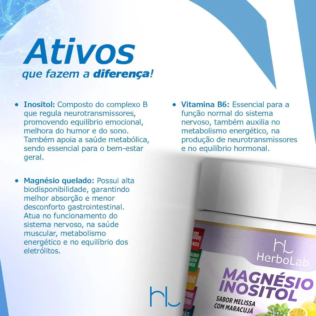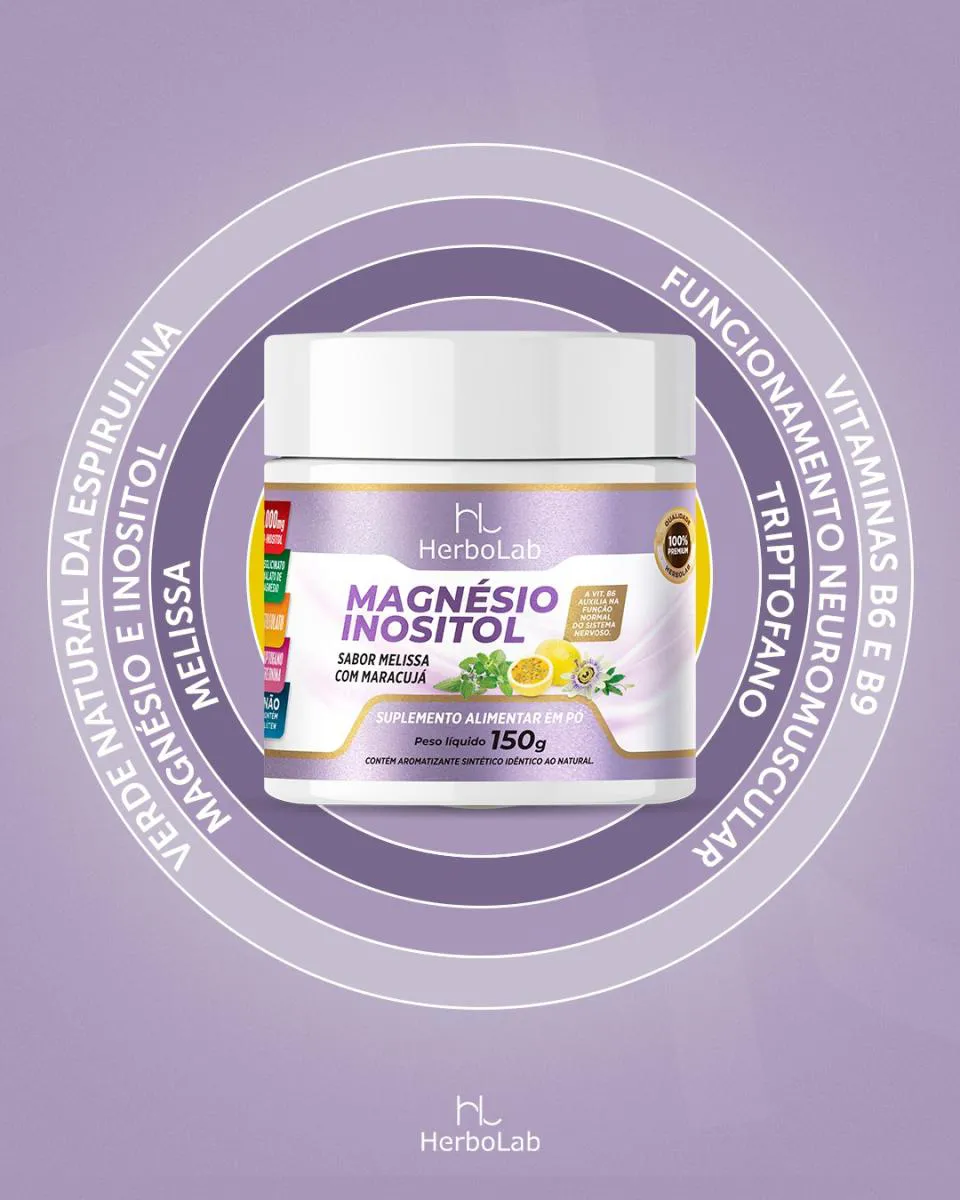 O Magnésio Inositol da Herbolab serve para promover o relaxamento, melhorar o humor e a qualidade do sono. Ele combina magnésio, inositol e geralmente inclui vitaminas B6 e B9 para ajudar a reduzir o estresse, ansiedade e melhorar o bem-estar mental e emocional. Benefícios do Magnésio Inositol Herbolab -Combate ao estresse e ansiedade: A combinação de inositol e magnésio pode ajudar a diminuir hormônios do estresse e irritabilidade, promovendo uma sensação de calma. -Melhora da qualidade do sono: Auxilia no relaxamento mental e físico, contribuindo para noites de sono mais tranquilas e combate à insônia. -Equilíbrio emocional: Contribui para a regulação do humor, diminuindo a sensação de tristeza profunda e aumentando o bem-estar. -Apoio ao sistema nervoso: O magnésio quelado e a vitamina B6 presentes na fórmula fornecem suporte ao sistema nervoso. -Redução da fadiga: Ao melhorar a qualidade do sono, ajuda a combater o cansaço decorrente de noites mal dormidas. Composição: O produto contém magnésio, inositol e vitaminas B6 e B9. É formulado para ser livre de glúten e lactose. Modo de usar: O suplemento é frequentemente vendido em pó com sabor de maracujá, para ser dissolvido em água.