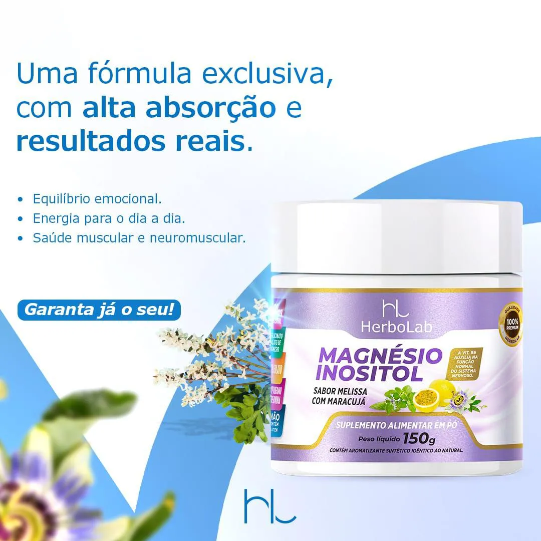 Magnésio Inositol sem Glúten em Pó Sabor Maracujá 150G Herbolab