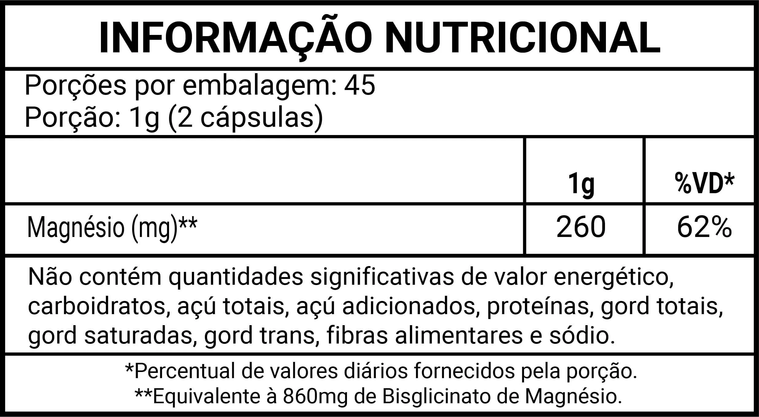 Bisglicinato de magnésio, celulose microcristalina, silicato de magnésio (INS 553i), estearato de magnésio (INS 470 iii), dióxido de silício (INS 551), gelatina (composição da cápsula).