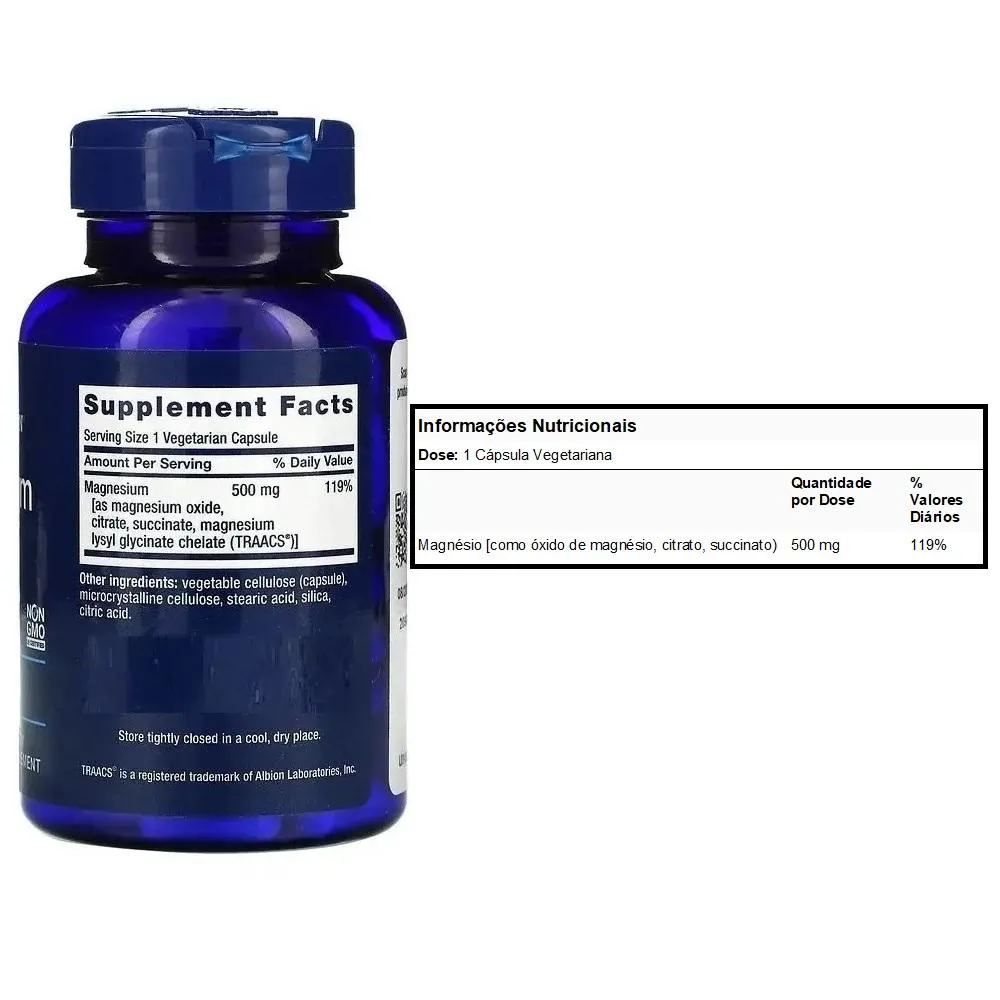 Magnésio Life Extension é um mineral essencial para auxiliar na produção e metabolismo de energia, contração muscular, transmissão de impulsos nervosos e mineralização óssea. Além disso, é um cofator necessário para cerca de 300 enzimas. Magnésio Life Extension - Como Tomar Sugere-se tomar cápsula uma a três vezes ao dia, com ou sem alimentos, ou conforme recomendado por um profissional de saúde. Magnésio Life Extension - Composição Magnésio. Outros ingredientes Celulose vegetal (cápsula), celulose microcristalina, ácido esteárico, sílica, ácido cítrico. Magnésio Life Extension - Informação Nutricional Quantidade por porção Magnésio (como óxido de magnésio, citrato, succinato, quelato de lisil glicinato de magnésio TRAACS®) 500 mg Produto isento de registro conforme RDC 27/08/2010.