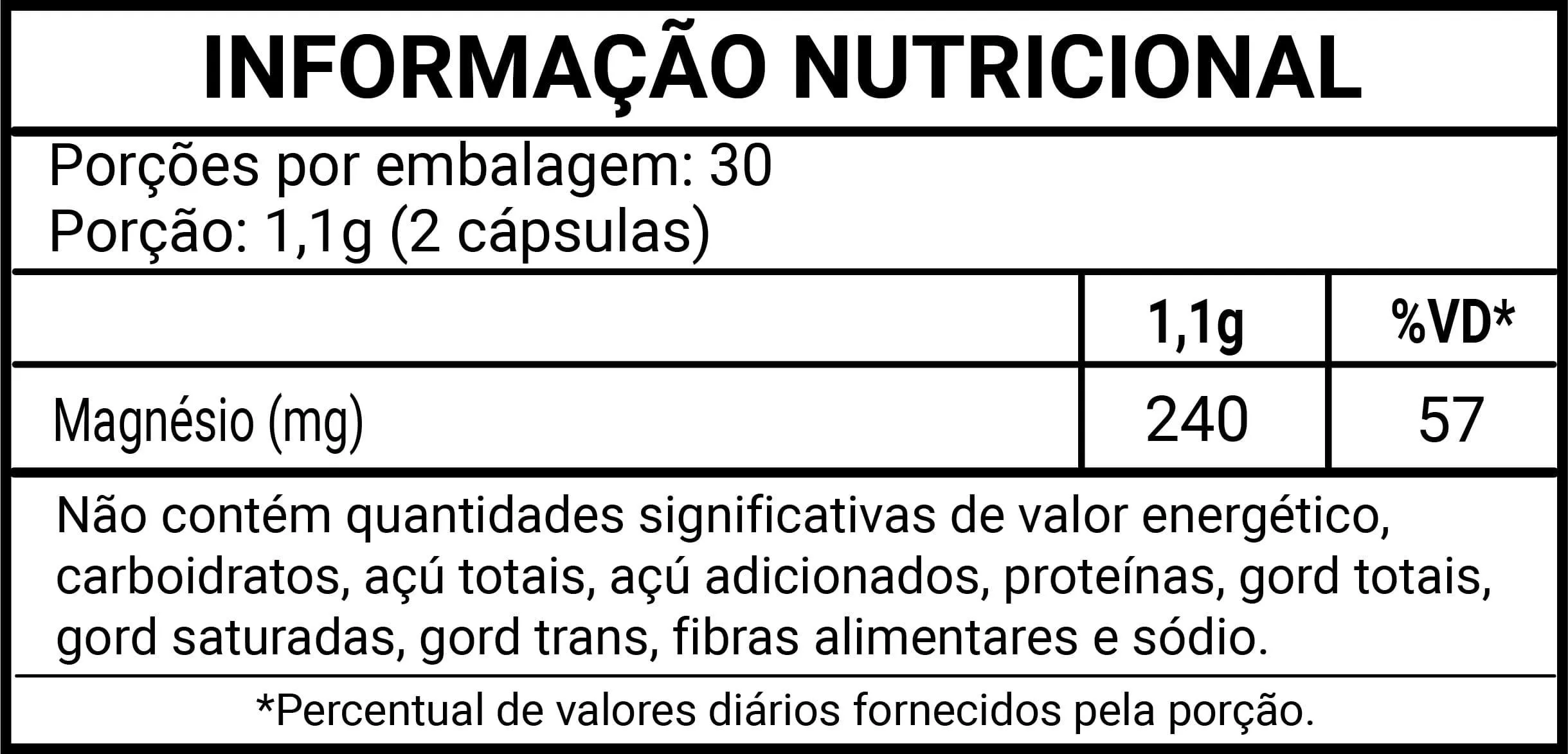 Ingredientes Ativos: Malato de Magnésio; Composição da Cápsula: Gelatina, Água; Corantes: Azul Brilhante, Vermelho 40, Amarelo de Quinolina e Dióxido de Titânio
