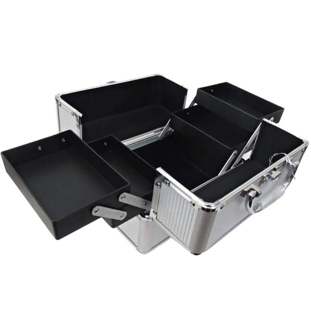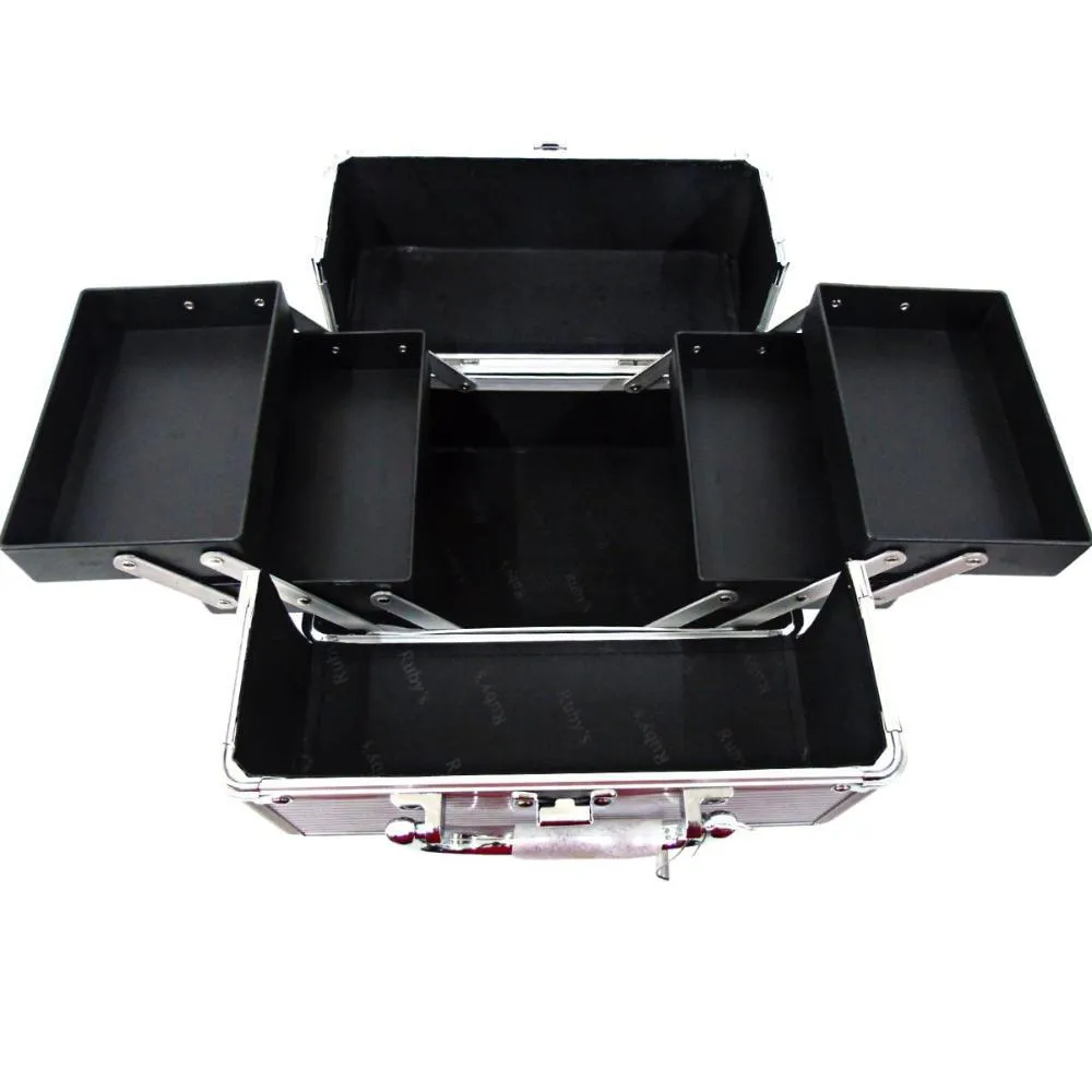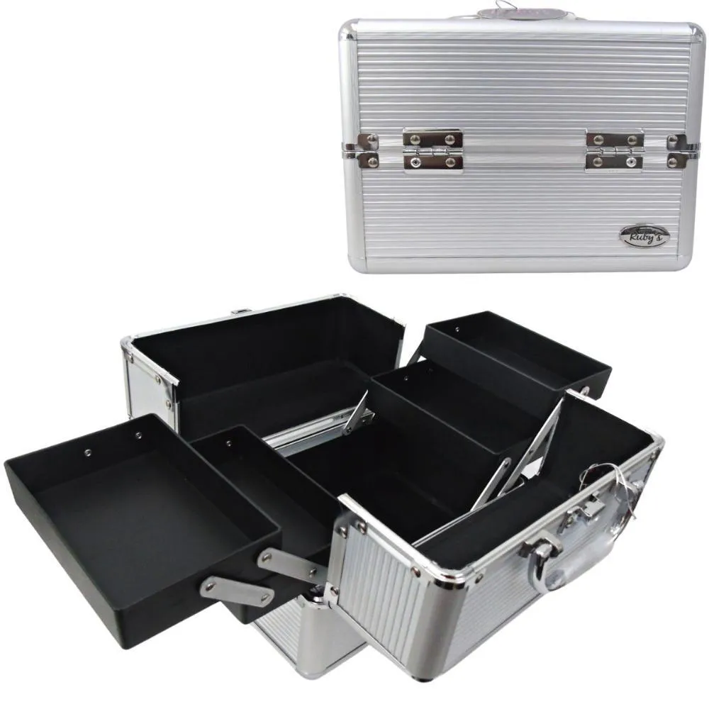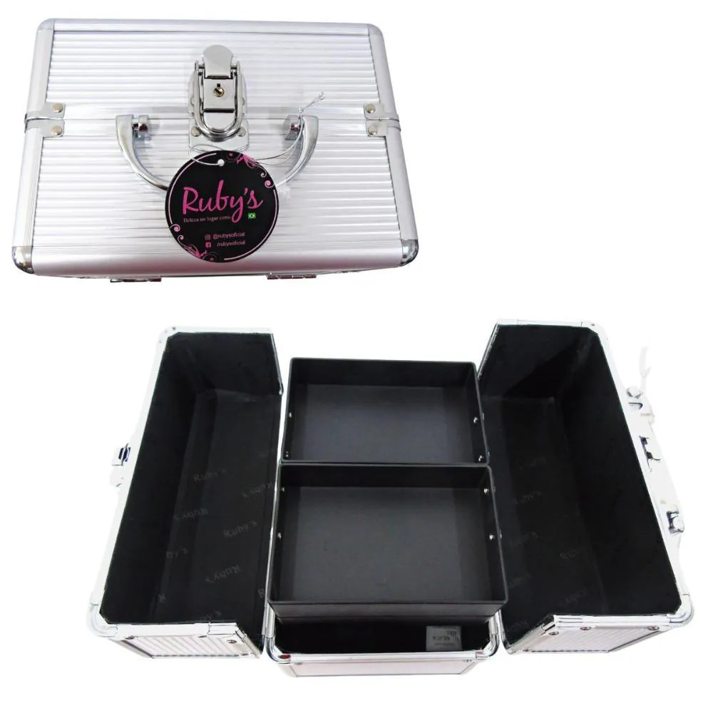 Maleta de maquiagem Ruby´s Prata A maleta de maquiagem Ruby´s é leve, o que facilita o seu dia a dia, deixando suas maquiagens e demais acessórios totalmente organizados e sem dificuldades para o transporte. . Benefícios: - Material leve e mais fácil de carregar. - Abertura com tranca e trava. - Contém quatro bandejas. - Acompanha duas chaves. . Material: Aluminum Alloy, MDS Board, PVC Leather, Polyester Cloth . Medidas aproximadas da maleta: Altura: 15cm; Largura: 22cm; Profundidade: 15cm;