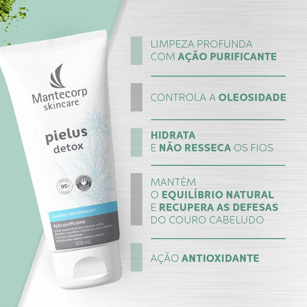 PIELUS DETOX é um shampoo adstringente com ação purificante, indicado para cabelos mistos e oleosos e couro cabeludo sensível.