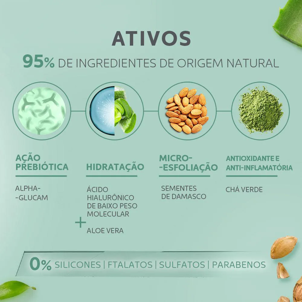 Alpha Glucam; Ácido Hialurônico; Aloe Vera; Chá Verde; sementes de damasco.