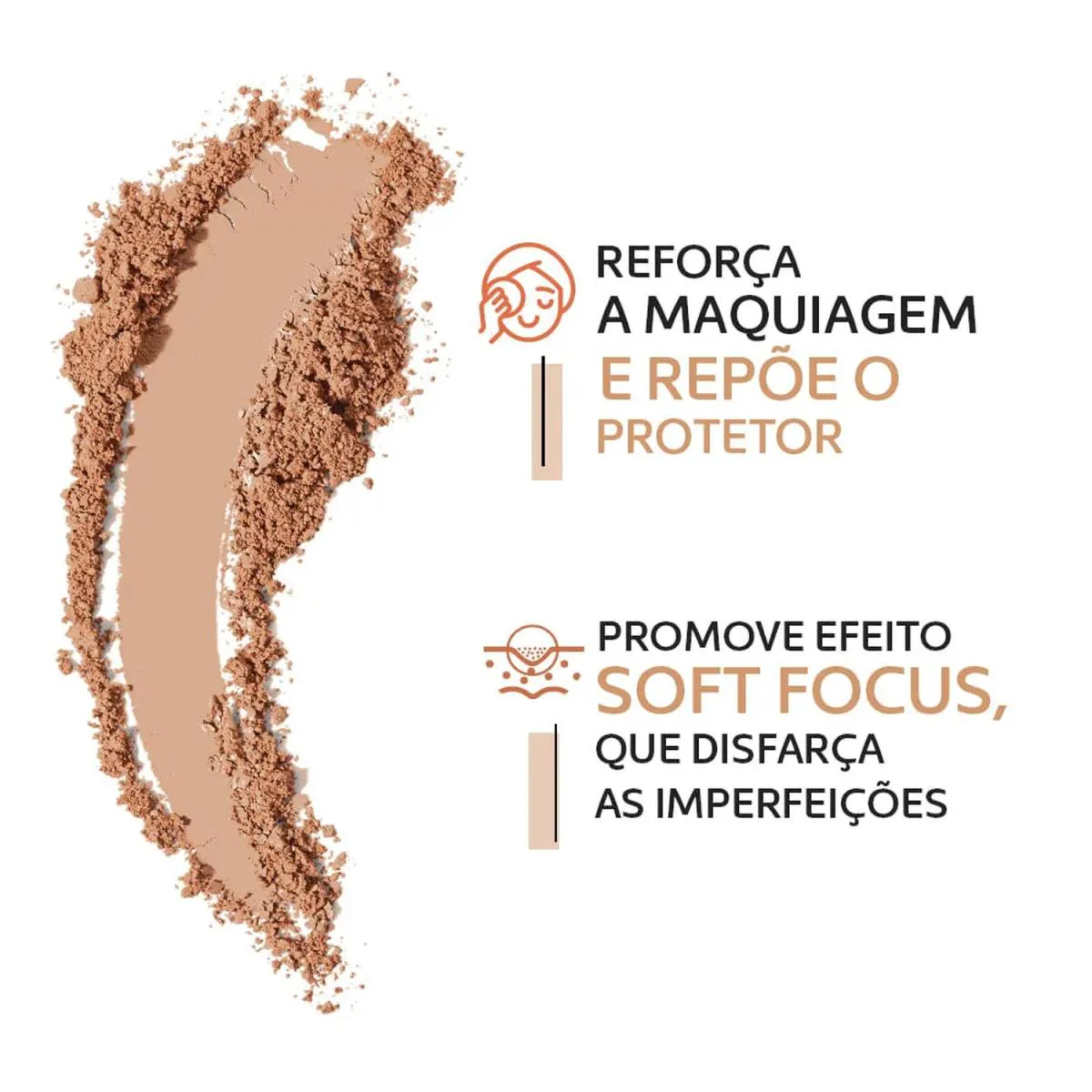 - Textura em pó compacto com efeito mate natural.