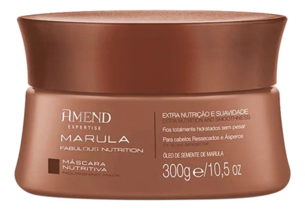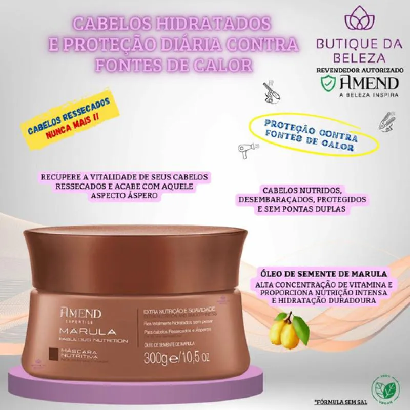 Somos a BUTIQUE DA BELEZA Uma empresa especializada no comércio de cosméticos e Semijoias. Estamos sempre entre os Melhores Vendedores. NOSSO COMPROMISSO É COM VOCÊ! SEU CONFORTO E SEGURANÇA SÃO NOSSOS PROPÓSITOS SERVIR E AJUDAR SÃO NOSSOS DEVERES MÁSCARA AMEND EXPERTISE MARULA FABULOUS NUTRITION 300G Se você sofre com cabelos ressecados e ásperos devido ao uso intenso de fontes de calor (secador e prancha) essa é a máscara perfeita para você. Amend Marula é a máscara que será sua aliada contra a perda de umidade e ressecamento dos fios. De origem vegana, e ativos como o óleo da semente de Marula e a vitamina e, estes contribuem por formar um escudo termoprotetor anti desidratação, que favorece a retenção de umidade e previne a formação de pontas duplas. De fácil aplicação Marula Fabulous Nutrition ainda auxilia o desembarace, recupera a vitalidade e a elasticidade dos fios. Tenha seu cabelo hidratado, nutrido e sempre protegido com a Máscara Amend Marula Fabulous Nutrition. ATIVOS - ÓLEO DE SEMENTE DE MARULA Com alta concentração de Vitamina E, sua fórmula proporciona nutrição intensa, além de reter a hidratação dentro dos fios, evitando o ressecamento. INDICADOS - Cabelos Ressecados. - Cabelos Ásperos. - Cabelos Secos. - Cabelos Opacos. - Todos os Tipos de Cabelos. BENEFÍCIOS - Nutrição Intensa. - Hidratação Duradoura. - Termoproteção. - Brilho. MODO DE USO Após o uso do shampoo, aplique a Máscara Amend Marula por todo comprimento e pontas e deixe agir por alguns minutos. Em seguida prossiga com o enxágue Dica da Butique da Beleza Para um resultado otimizado, recomendamos o uso de toda linha Amend Expertise Marula Fabulous Nutrition.